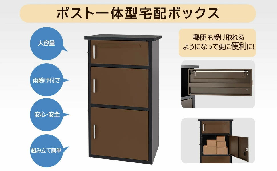 ※返品について 「宅配の受け取りに不便を感じている…」そんなあなたに! 「宅配ボックス付きポスト」を設置しませんか。 今までの不便な受け取りから開放されますよ。 【宅配ボックス部分使用方法】 1.扉の内側にある印鑑で、伝票に押印後、印鑑を戻してください。 荷物の受け取り時に必要な印鑑の収納を扉の内側部分に設置しています。 2.配達物をボックス内に入れてください。 3.扉を閉めて左側にあるワンタッチロックを押してロックをしてください。 【荷物の受け取り】 1.キーを使用し、ワンタッチロックを解除します。 2.荷物を取出し扉を閉めます。 ※ロックをすると配達物を入れることが出来ませんので、ご注意ください。 宅配ボックス部分は、ワンタッチロックで簡単にロックが出来る機能となっております。開錠は、付属のシリンダー錠で行います。 盗難防止金具で、盗難を防ぐ役割をしています。 【大容量サイズ】 サイズ:幅450×奥行335×高さ880mm上段:幅404×奥行310×高さ174mm中段:幅404×奥行310×高さ274mm下段:幅404×奥行310×高さ342mm たっぷり入る大容量タイプ。内側に印鑑収納付きです。 【投稿口防犯緩衝装置】3cmx30cmと大きいサイズのポスト投函口 ポスト投函口は防犯緩衝を設置。 3cm以内の新聞・郵便・メール便・クロネコゆうパケットなどのポスト投函が対応可能 【配達ドライバー様への使用説明・印鑑収納】 配達ドライバー様への使用説明マグネット付き!見やすい場所に貼ってください。 扉の内側に印鑑収納があります(受領印もこれで安心) 配達の荷物を入れたら、ワンタッチロックを押してロック、配達完了 【安全・安心】 押すだけで、ロックが出来る、ワンタッチロックを使用しています アンカーボルトで「宅配ボックス付きポスト」を固定することで、盗難や自然災害等から守ることが出来ます ※アンカーボルト固定しなくても使用可能です 盗難防止金具に付属のワイヤーを通し、ダイアル式南京錠を取り付け、二重盗難防止をしています 【防錆防水】 屋根部分は、防水素材を使用しているので、雨の日も安心 扉部分に騒音防止のクッションを取り付けているので、深夜などの荷物の取出しも扉の音を気にせず取り出せます 扉に防水溝があるので、荷物や手紙等、雨水に濡れることがありません 下段のアンカーボルトの上に蓋板をするので、下段がフラット状態になり、荷物の出し入れが簡単です 【この大きさの荷物が受け取れます!】 中段:404x310x274mmまで対応可 下段:404x310x342mmまで対応可 下の段は、2リットルのペットボトル9本も余裕で入ります。 重い&大きい荷物の事を心配する必要がなくなります。 メーカー TOOLS LIFE 商品説明 一戸建て用の宅配ボックス付きポストです。 残業時間を気にしたりすることなく、プライベートの時間を有効に使えるようになります。 荷物が届く時間を気にせず、外出やお家の用事が出来ます。 不在票がポストに投函され、再配達を依頼する面倒な手間も省けます。 配逹の時間に予定を合わさずに済み、受け取り時間の手間から解放されます。配逹員との接触を避け、宅配便の受け取リをもっと安全にします。 商品仕様 使用環境:−5℃〜40℃ 本体サイズ:幅450×奥行335×高さ880mm ポスト部分:幅450×奥行335×高さ174mm 荷物部分:幅450×奥行335×高さ274mm 荷物部分:幅450×奥行335×高さ342mm ワイヤーの長さ:2m 耐久重量:約30kg 重さ:13kg 付属部品:各種ネジ、アジャスター、南京錠、ワイヤー、解錠鍵、業者様向けプレート、台座 製造国 中国 注意事項 ※海外輸入品のため、多少のキズなどがあることもございます。予めご了承ください。 ※リニューアル・改良に伴い、予告なく商品の仕様が変更になる場合がございます。何卒ご了承くださいませ。 【検索用ワード】 宅配ボックス付きポスト 宅配BOX 新聞受け 郵便 メール便 クロネコゆうパケット 大容量 取扱説明書 収納BOX メールボックス 鍵付き 置き配 盗難防止 一戸建て 個人宅 大容量 雨濡れ防止