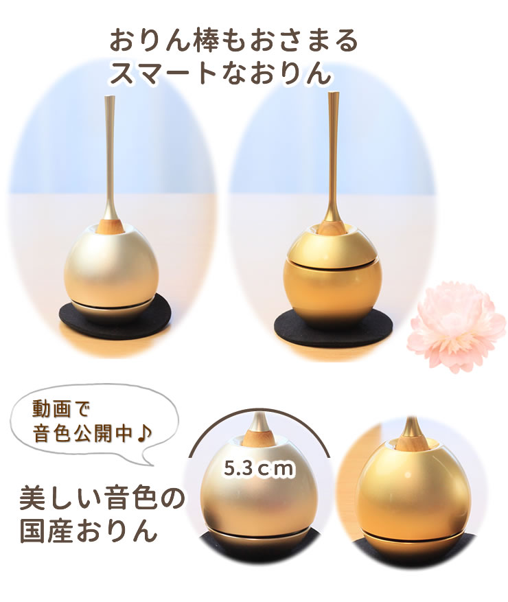 おりんにおりん棒が収納できるように穴があいていますので、お仏壇やご供養の場でも スペースを取らずにおいておけます。 おりんの上下で音色が違いますのでお好きな音色であの子へ想いを届けてあげてください。 厚手のフェルト生地の専用マットを敷くので滑り止めにもなり、さらに仏壇を痛めません。 おりんの『リーン』という音色で心を鎮め、目を閉じ落ち着いた気持ちで愛するペットちゃんに想いを届けてください。 『ありがとう』の感謝の気持ちや『おはよう』や『おやすみ』のあいさつ、日々の報告など、たくさん話しかけてあげてください。 みなさまの日常に寄り添うおりんとなりますように。