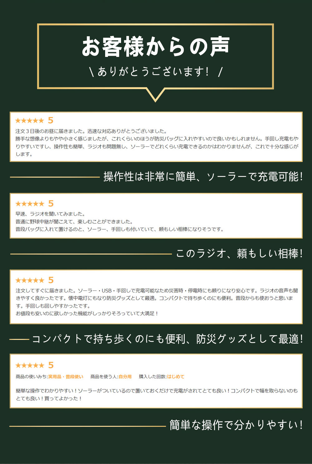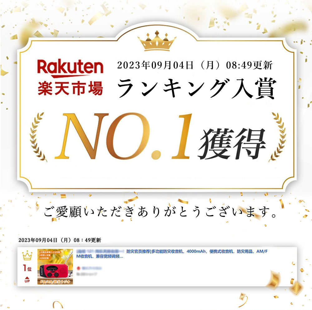 メーカー希望小売価格はメーカーサイトに基づいて掲載しています FM/AM/防災ラジオ 信号受信:AM 520-1710Khz / FM 76-90Mhz。 防水性:IPX-3 台風、津波、地震、停電など災害を防ぐための緊急対策ラジオです。このラジオライトは、停電、電気通信の不安定または中断された場合に、外界からの災害情報を収集可能。緊急時、救援者は迅速に位置を特定する可能。 高輝度懐中電灯 高輝度3つのLEDライトを内蔵された充電式ライト、備えておくと安心なライトです。 外装全体は明るくの赤、光不足の場合も目に立ちます。 モバイルバッテリー 2000mahバッテリーを内蔵され、モバイルバッテリーとしても使用可能。緊急時に携帯電話などUSBグッズに携帯充電器などとして充電可能。 3つの充電方法 手回し充電手回しラジオ:製品の背面にあるハンドルを回すと充電可能。ソーラー充電ラジオライト:ソーラーパネルを日差しの方向に向けると、自動的に充電可能 USBケーブルで充電:付属しているUSBケーブルでUSBポートから充電可能 小型・超軽量 12.8cm * 6cm * 4.5cm 重量200g!緊急時に持ち運びやすく、収納しやすい。 完全防水ではないので、水に浸すことはいけません