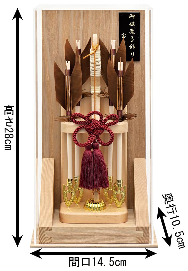 サイズ:間口14×奥行10.5×高さ28(cm)(社)日本人形協会認定 優良店律(ナチュラル) 7号 アクリルケース商品番号:h081-mm-hm2604【2026年度新作破魔弓】【おすすめ人気工房】奥行10.5cmと薄型アクリルケースで仕立てた、すっきりとした印象の破魔弓飾りです。自然のぬくもりを感じる木目調デザインに、枠のないクリアなアクリルケースを合わせ、明るくやわらかな色合いでまとめました。現代の暮らしになじむ、洗練されたデザインが魅力です四本の弓矢には「四方から魔を避ける」という願いがこめられました。薄型なので、玄関のチェストやリビングの棚など、省スペースでも手軽にお飾りいただけます。伝統文化の趣を大切にしつつ、現代の感性で仕立てた一品。お子様の晴れやかな初正月に、ぜひお飾りください。サイズ:間口14×奥行10.5×高さ28(cm)破魔弓は、様々な厄から身を守るための飾りとして江戸時代初期から男の子が生まれた家に、子供の健やかな成長を願って贈る習慣があります。昔は、お正月に弓矢で的を射ってその年の占いをする遊びでしたが、弓の的をハマ(的の中心)と言い、破魔の字をあてはめ「悪い魔を打ち破る」となったのです。また、弓矢は元々武器のひとつでしたが、その威力から邪気をはらい、悪魔を恐れさせるという特別な力が備わっていると考えられていました。大切なお子様が丈夫にすくすくと育つようにとの願いが込められております。一つ一つ手作り品につき、細部(弓・太刀・房など)の仕様が若干変わる場合がありますので、予めご了承ください。こちらの商品は予定数を超えますと、工房より取寄せとなります。手作り品につきご注文時期によっては、ご希望日時にお届けできない場合やご用意出来ない場合がございます。その際はメールにてご連絡いたします。1.お支払方法は、クレジットカード・代金引換(30万円まで)よりお選びいただけます。2.ギフト包装、のし紙、対応できます。注文画面で、お選び下さい。お名前などは備考欄にお書き下さい。3.30000円以上の商品は送料無料です。(一部除外品あり)4.手造り品ですので商品性質上又、さらなる向上 のため仕様変更がある場合がございます。衣装の模様や柄は、同一のお着物を用いておりますが、商品ごとに若干異なる場合がございます。予めご了承くださいませ。5.商品画像はなるべく忠実に撮影しておりますが、モニターなどによって、異なる場合や、また、天然素材を使いますので、木目や風合いは、異なる場合がございます。あらかじめご了承ください。商品は豊富に用意しておりますが、時節により、万一完売の際はご容赦下さいませ。本支店店頭での販売もしておりますので、同時期に完売の可能性もございます。【2026年度新作】破魔弓ケース飾り 律(ナチュラル) 7号 アクリルケースh081-mm-hm2604 【2026年度新作破魔弓】【おすすめ人気工房】奥行10.5cmと薄型アクリルケースで仕立てた、すっきりとした印象の破魔弓飾りです。自然のぬくもりを感じる木目調デザインに、枠のないクリアなアクリルケースを合わせ、明るくやわらかな色合いでまとめました。現代の暮らしになじむ、洗練されたデザインが魅力です四本の弓矢には「四方から魔を避ける」という願いがこめられました。薄型なので、玄関のチェストやリビングの棚など、省スペースでも手軽にお飾りいただけます。伝統文化の趣を大切にしつつ、現代の感性で仕立てた一品。お子様の晴れやかな初正月に、ぜひお飾りください。サイズ:間口14×奥行10.5×高さ28(cm)破魔弓は、様々な厄から身を守るための飾りとして江戸時代初期から男の子が生まれた家に、子供の健やかな成長を願って贈る習慣があります。昔は、お正月に弓矢で的を射ってその年の占いをする遊びでしたが、弓の的をハマ(的の中心)と言い、破魔の字をあてはめ「悪い魔を打ち破る」となったのです。また、弓矢は元々武器のひとつでしたが、その威力から邪気をはらい、悪魔を恐れさせるという特別な力が備わっていると考えられていました。大切なお子様が丈夫にすくすくと育つようにとの願いが込められております。一つ一つ手作り品につき、細部(弓・太刀・房など)の仕様が若干変わる場合がありますので、予めご了承ください。こちらの商品は予定数を超えますと、工房より取寄せとなります。手作り品につきご注文時期によっては、ご希望日時にお届けできない場合やご用意出来ない場合がございます。その際はメールにてご連絡いたします。
