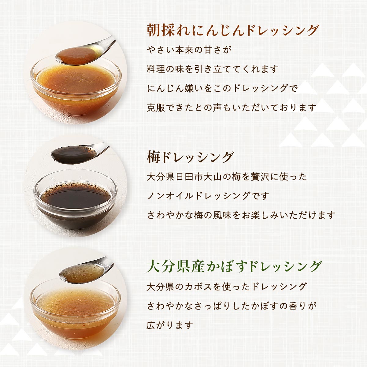 【商品特徴】TOPPA SELECTION 人気5種のドレッシング詰合せです。 かぼす、にんじん、しいたけ、白ねぎ、梅、大分の美味しい味力をぎゅっと詰め込んだドレッシングギフトです。 150mlサイズと、とても使いやすい容量のドレッシングを5本セットにしました。 もらって嬉しいボリューム感です。 【にんじん】 やさい本来の甘さが料理の味を引き立ててくれます。 特にお子様からの評判がよく、にんじん嫌いをこのドレッシングで克服できたなどの声もいただいております。 【梅】 大分県日田市大山の梅を贅沢に使ったノンオイルドレッシングです。 さわやかな梅の風味をお楽しみいただけるドレッシングです。 【カボス】 大分県のカボスを使ったドレッシングです。 【白ねぎ】 大分県産の白ネギを使用したさっぱりとした旨味のある万能ドレッシングです。 生野菜のグリーンサラダ、豚しゃぶサラダ、各種鮮魚のカルパッチョなど冷菜系のお料理に合わせていただきたい商品です。 【しいたけ】 大分県産のしいたけを使ったドレッシングです。 しいたけの旨味成分が料理の味を引き立てます。 商品説明メーカー所在地 原材料 【にんじん】人参(国産)、りんご酢、玉ねぎ、うすくちしょうゆ、上白糖、なたね油、オリーブ油、こいくちしょうゆ、本みりん、酵母エキス、米粉、塩、おろしにんにく(にんにく、食塩)/酒精、(一部に小麦・大豆・りんごを含む) 【梅】上白糖(国内製造)、紫蘇液(梅酢、紫蘇、食塩)、醸造酢、梅ピューレ、塩、梅紫蘇チップ、酵母エキス、米粉、唐辛子、ブラックペッパー/酒精、香料、アカダイコン色素、アカキャベツ色素 【カボス】上白糖(国内製造)、かぼす果汁、醸造酢、なたね油、塩、ゆず果汁、かぼす果皮、酵母エキス、ブラックペッパー、米粉、唐辛子/香料 【白ねぎ】白ネギ(大分県産)、醤油、醸造酢、本みりん、食用植物性油脂、砂糖、本わさび、食塩、にんにく、酵母エキス、酒粕、香辛料/酒精、(一部に小麦・大豆を含む) 【しいたけ】椎茸(大分県産)、こいくちしょうゆ、なたね油、醸造酢、日本酒、上白糖、玉ねぎ、酵母エキス、赤パプリカ、カツオ節エキス、おろしにんにく、生姜、米粉/酒精、(一部に小麦・大豆を含む) サイズ 138×350×45(mm) 原産国 日本 内容量 150ml ×5本(にんじん、梅、カボス、白ねぎ、しいたけ) アレルギー表示 小麦、大豆、りんご 温度帯 常温 メーカー名 トッパソースジャパン株式会社大分県大分市森町西1-3-10