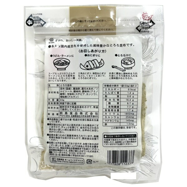●国内産昆布のみを使用した風味豊かなとろろ昆布です。 ●うどん・ラーメンや、おにぎり、とろろ汁に ※冷蔵庫で保存されますと、内容物が乾燥したり、温度差により湿る場合がありますのでお避け下さい。 【原材料】昆布(国産)、醸造酢、還元水あめ/ソルビトール、酸味料、調味料(アミノ酸等)、甘味料(ステビア、カンゾウ)、増粘剤(プルラン) 【栄養成分 1袋(33g)当たり】 エネルギー:61kcal、たんぱく質:1.4g、脂質:0.6g、炭水化物:16.4g(糖質:8.7g、食物繊維:7.7g)、食塩相当量:1.7g、カリウム:1802mg、カルシウム:254mg、鉄:1.5mg 【内容量】33g 【保存方法】直射日光・高温多湿を避けて、常温で保存してください。 【製造者】前島食品株式会社 【特記】 ※商品の改訂等により、パッケージデザイン・内容量等は予告なく変更される場合がございます。 ※商品は自社店舗販売と在庫を共有しているため、在庫更新のタイミングにより、在庫切れの場合やむをえずキャンセルさせていただく可能性があります。●国内産昆布のみを使用した風味豊かなとろろ昆布です。 ●うどん・ラーメンや、おにぎり、とろろ汁に ※冷蔵庫で保存されますと、内容物が乾燥したり、温度差により湿る場合がありますのでお避け下さい。 【原材料】昆布(国産)、醸造酢、還元水あめ/ソルビトール、酸味料、調味料(アミノ酸等)、甘味料(ステビア、カンゾウ)、増粘剤(プルラン) 【栄養成分 1袋(33g)当たり】 エネルギー:61kcal、たんぱく質:1.4g、脂質:0.6g、炭水化物:16.4g(糖質:8.7g、食物繊維:7.7g)、食塩相当量:1.7g、カリウム:1802mg、カルシウム:254mg、鉄:1.5mg 【内容量】33g 【保存方法】直射日光・高温多湿を避けて、常温で保存してください。 【製造者】前島食品株式会社 【特記】 ※商品の改訂等により、パッケージデザイン・内容量等は予告なく変更される場合がございます。 ※商品は自社店舗販売と在庫を共有しているため、在庫更新のタイミングにより、在庫切れの場合やむをえずキャンセルさせていただく可能性があります。