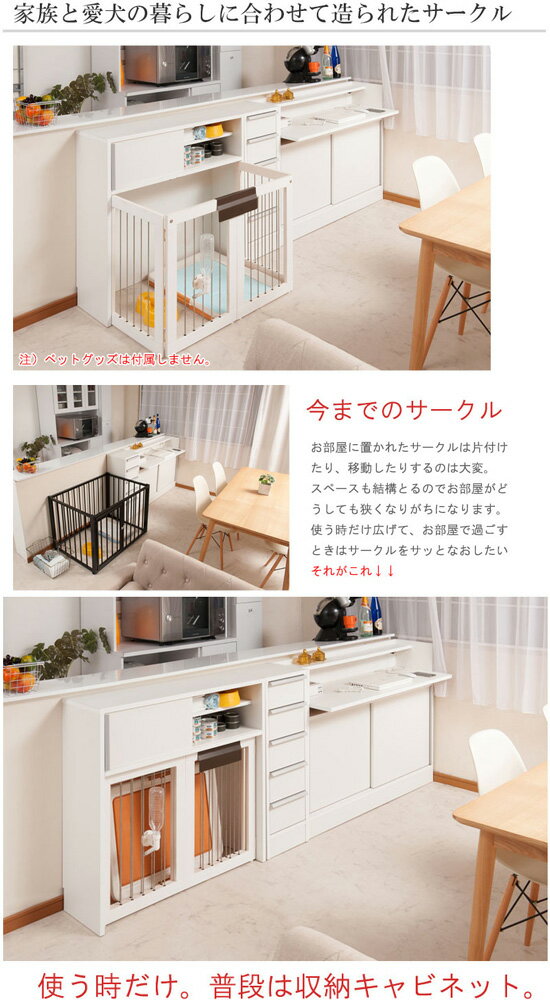 [スタイリッシュシリーズ] 幅30チェスト 幅90引戸 幅120引戸 幅90デスク 幅120デスク 幅90折り畳みケージ スタイリッシュデザイン カウンター下幅90折り畳みペットケージ キッチンカウンター下ペットゲージ 幅90cm [日本製・完成品] シンプルに仕上げたスタイリッシュシリーズ。木製ワンタッチでたたんでしまえる収納型ケージ。インテリア性も兼ね備えたペット家具『すむぺっとシリーズ』。 収納も付いたドッグサークルは、愛犬をサークルに入れるときだけ広げるので、普段は収納キャビネットのように使えるのが魅力。 本体の奥行は約29.5cmでカウンター下や窓下に置いても邪魔にならないサイズ感。他のシリーズと合わせて、キッチンやリビングなどでお洒落に収納できます。扉を開ける取っ手は上から下に伸びた、シルバー色の取っ手が付いています。しっかりとした造りで使いやすい仕様になっています。 愛犬との時間を大切にしている方が増えてきている現在。 愛犬との暮らし方を考えていくと、お部屋の間取りも重要になってきます。 インテリア性も高く、しかも使い勝手が良いサークルやケージは中々ないので今回、愛犬と暮らす家庭からアンケートをいただき、完成したのがインテリアサークルです。 リビングを広く使って、安心して愛犬と暮らす。 そんなライフスタイルを楽しみたい方に、このサークルをお勧めいたします。 ペットたちも安全に、健康で暮らしていける部屋つくりを。 カウンター下ペットサークル 幅90cm ケージの特徴 スタイリッシュデザインシリーズ 幅90 折りたたみケージ詳細 【商品名】 スタイリッシュデザイン カウンター下幅90折り畳みペットケージ 【サイズ(約)】 本体:幅90.5×奥行(本体:29.5、ケージオープン時70)×高さ88cm ケージ内寸:幅81.5×奥行65×高さ61cm 引戸内寸:(左右共通)幅42×奥行25.5×高さ22.5cm 【重量(約)】 23kg 【カラー】 ホワイト:no-0129 ダークブラウン:no-0135 【仕様】 素材/本体:強化プリント紙化粧繊維板 棚板/可動板2枚 耐荷重量/天板:(約)10kg 完成品 【製造国】 日本製 【区分】 家具 【メーカー】 ナサ流通企画株式会社 広告文責 株式会社エヌ・エス・ティー 076-254-0557