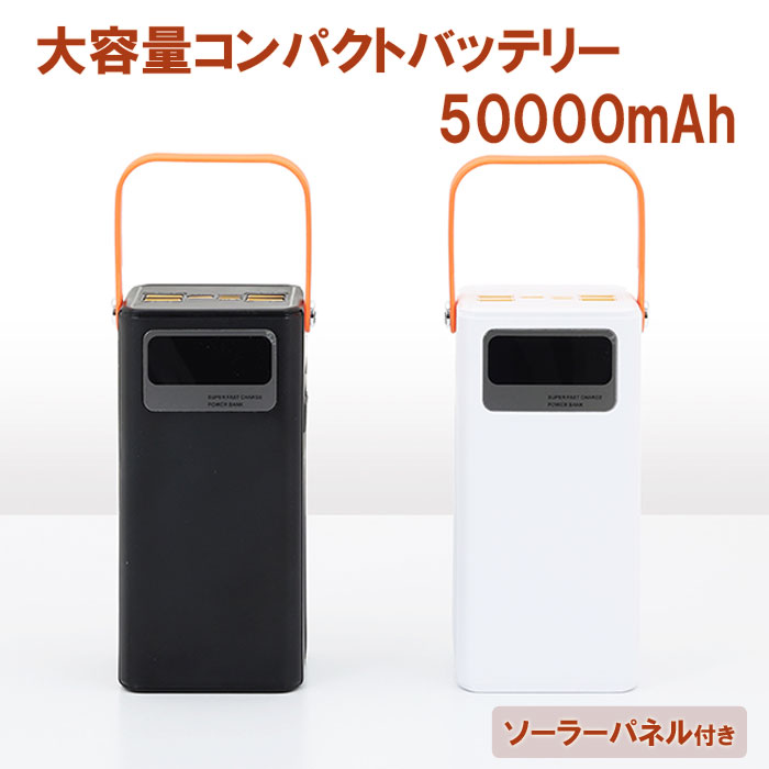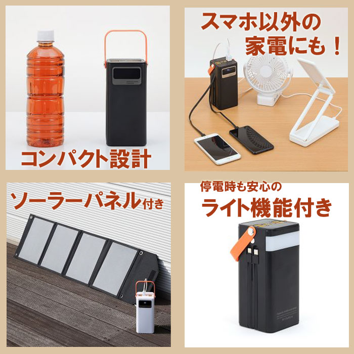 大容量50000mAh コンパクトバッテリー/ソーラーパネルセット DX-HPB 大容量50000mAh コンパクトバッテリー/ソーラーパネルセット DX-HPB スマホ1台約1時間の急速充電が可能な大容量50000mAhのコンパクトバッテリーです。500mlのペットボトルほどのサイズ感で、持ち運びもラクラクです!折りたたみのソーラーパネルとセットなので、ソーラー充電も可能です。屋外や災害時に便利なLEDライトがついていて、停電時の暗闇でも安心です。バッテリーのカラーは、ホワイトとブラックの2色からお選び頂けます。スマホ以外でも、ノートPCやタブレット、ポータブル扇風機やLEDランタン、電気毛布などの家電にも使用可能です。災害対策としては、もちろん、普段のキャンプや旅行にも重宝しますね。一家に一台備えて置きたい、コンパクトなバッテリーとソーラーパネルセットです。 災害時の電源問題に安心の大容量バッテリー! ●3WAY電源 ●急速充電 ●ソーラーパネルセット ●LEDライト付き ●充電ケーブル付き ●充電残量表示 ●安全保護機能付き 過電流保護・過電圧保護・短絡保護、過熱保護 ●ペットボトルサイズ ●4台同時充電可能 ●スマホ1台約1H急速充電(2台で約1.5H。最大7台迄充電可能、適正台数は4台) ●屋外や災害時に便利なLEDライト(非常用点滅付き) (ボディ横スイッチ2度押しLED点灯 HI→LO→Hiflash→Loflash 2度押しOFF) ●折畳めば、軽量コンパクトで持ち運びにラクラク(カラビナ2個付属) ●出力は急速充電タイプ(USBTypeA /USBTypeC) 非常時の備えに!大容量50000mAhのコンパクトバッテリーとソーラーパネルセットです 大容量50000mAh コンパクトバッテリー/ソーラーパネルセット DX-HPB の詳細 ■商品名 大容量50000mAh コンパクトバッテリー/ソーラーパネルセット DX-HPB ■サイズ(約) バッテリー:幅71.5×奥行66×高さ149mm ソーラーパネル:(収納時)幅250×高さ190×厚み35mm、(展開時)幅935×高さ250×厚み10mm ■重量(約) バッテリー:1000g ソーラーパネル:750g ■バッテリー容量 50000mAh ■出力 最大22.5W(各出力ポート合計) ■電池定格容量 50000mAh/3.7V/185Wh リチウムポリマー電池 ■対応機種 iPhoneおよびUSB端子で充電するスマートフォン等の電子機器 ■入力 DC5V 2A/DC5V 4.5A ■出力 DC5V 2A/DC5V 4.5A ■入力ポート Type-c(1)・Micro(1)・ライトニング(1)のうち1箇所 ■入力ポート Type-c(1)・Micro(1)・ライトニング(1)のうち1箇所 ■出力ポート USBTypeA(4)・Type-c(2)・ライトニング(1)の最大7箇所 ■仕様(ソーラーパネル) 出力ポート:USB-C(5V/2.4A, 9V/2A, 12V/1.5A) ※最大、 USB-A(5V/2.4A, 9V/2A, 12V/1.5A) ※最大 出力:最大24W ■付属品 取扱説明書、専用充電コード2本(本体に付属)、急速充電器、TypeA-Cコード、ソーラーパネルセット ■メーカー 株式会社TOHO ■区分 バッテリー