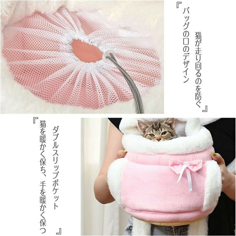 【ペット用抱っこひも・商品仕様】適用ペット:5kg以内の小型ペット。まるでトートバッグのようなデザインのペット用バッグです(小・中型猫用・小型犬用・うさぎ・小型ペットに最適) 【高品質の素材・人間工学肩ベルト】柔らかい綿生地とシャギー製短毛素材を採用し、柔らかな肌触りがよく、もふもふな触感があり、保温性・弾力性にも優れています。また、人間工学に基づきデザインした幅広い肩ベルトで、長時間背負っても疲れません、両手を解放して。 【ペットも飼い主さんも保温・安全性保護】厚手の柔らかい絨素材は、ペットの肌にも優しく、内側の暖かい空気を逃さなく、高い保温性を持って、冬にペットがお出かけるときの寒さを心配する必要はもうありません。両側にもシャギー製短毛付きのポケットがあり、飼い主さんの手を入れて超暖かくて。 【飛び出し防止】飛び出し防止ストラップ付きなので首輪につなげば安心です。 【様々なシーンにご使える】お散歩やサイクリング、運転、お買い物、旅行など様々な場合に利用でき、可愛いペットとのお出かけを楽しむことができます。いつもそばにいたり、荷物の多いお出かけも便利。