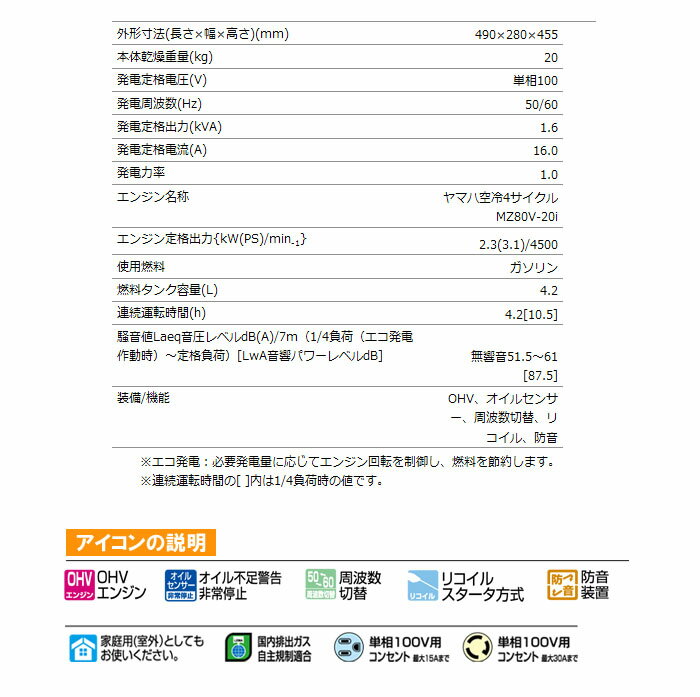 この商品と関連のある商品インバーターガソリンエンジン発電機 IEG900MYインバーターガソリンエンジン発電機 出力切替式 IEG950【個人宅配送不可】インバーターガソリンエンジン発電機 IEG2500【個人宅配送不可】インバーターガソリンエンジン発電機 IEG2800M【個人宅配送不可】インバーターガソリンエンジン発電機 IEG2801M【個人宅配送不可】インバーターガソリンエンジン発電機 IEG5500M-Yインバーターガスエンジン発電機 IEG900BGやまびこ(新ダイワ工業) インバーターガソリンエンジン発電機 IEG1600M-Yやまびこ(新ダイワ工業) インバーターガソリンエンジン発電機 IEG1600M-Y●新ダイワ(やまびこ)のIEG・IDGシリーズ発電機は商用電源と同等の良質な電気なので コンピュータ機器にも安心してお使いいただけます。●低騒音&低燃費のエコ発電機能 負荷に応じたエンジン回転数を設定し、低騒音と低燃費を可能とするエコ発電機能付です。●軽量&コンパクトボディ 発電体に高効率な多極オルタネーターを採用するなど、細部にわたる軽量設計により、 軽量小型化を実現しました。※こちらの商品は取寄せ出荷となります。欠品時には納期にお時間をいただく場合がございますので お手数ですが急ぎの場合はお問い合わせください。注文について注意事項メーカー(提携先)からのお取り寄せ商品となります。稀ではございますが欠品時は変動する場合もございますので、正確な納期はご注文の確認メールにてご案内させていただきます。特殊商品の為、代引決済はご利用頂けません。