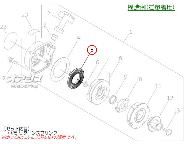 やまびこ リターンスプリングC 共立(kioritz) 肩掛式刈払機 SRE2625G2T/SRE2625LGT用【メール便可】やまびこ リターンスプリングC 共立(kioritz) 肩掛式刈払機 SRE2625G2T/SRE2625LGT用【メール便可】やまびこ(YAMABIKO)の下記ブランド用 リターンスプリングです。ご自身で機体整備のできる方向けの商品です。こちらの商品の返品・交換はお受けできませんのでご了承願います。 下記機種用のメーカー純正品もしくは純正互換品です。(他社製を含めた)他機種への適合可否等についてはお答えできませんのでご了承ください。■適合機種: 新ダイワ 背負式 エンジン刈払機 下記シリーズ RK1021-PT/ RK2023-BW/RK2023-PC/RK2023-PC20/RK2023-PT/RK2023-PT20/ RK2026-BW/RK2026-PC/RK2026-PC20/RK2026-PT/RK2026-PT20■適合機種: 新ダイワ 肩掛式 エンジン刈払機 下記シリーズ SSR2601-2T/SSR2601-PT■適合機種: 共立 背負式 エンジン刈払機 下記シリーズ RME2220LT/ RME2300B/ RME2320BW/RME2320LC/RME2320LT/ RME240/RME240A/RME240B/RME240V/ RME241/RME241B/RME241V/ RME2500LT/ RME26/RME26LC/RME26V/ RME260/RME260-15/RME260-A/ RME2600/RME2600-15/RME2600B/RME2600B-15/RME2600LC/RME2600V/ RME260B/RME260B-15/RME260B-A/RME260BL/RME260L/RME260V/ RME2620BW/RME2620BW-15/ RME2620LC/RME2620LC-15/RME2620LT/RME2620LT-15/ RME264/ RME2640■適合機種: 共立 肩掛式 エンジン刈払機 下記シリーズ KSR260L/KSR260U/ MTK26U/ SBE260U/SBE260UT/SBE260GT/ SRE210G/SRE210L/SRE210U/ SRE235G/SRE235L/SRE235U/SRE235G2/SRE235LG/SRE235UG/ SRE240G/SRE240G-A/SRE240L/SRE240L-A/SRE240U/SRE240U-A/ SRE242G/SRE242L/SRE242U/SRE243G/SRE243L/SRE243U/ SRE2600G/SRE2600L/SRE2600U/SRE2600G-15/SRE2600L-15/SRE2600U-15/ SRE2600GA/SRE2600LA/SRE2600UA/ SRE2600SL-L/SRE2600SL-U/SRE2600SL-UT/ SRE2605U/ SRE260G/SRE260G-15/SRE260L/SRE260L-15/SRE260LL/ SRE260P-A/SRE260PG/SRE260PGT/SRE260PGT-15/ SRE260PH/SRE260PHG/SRE260PT/ SRE260SL-L/SRE260SL-U/SRE260U/SRE260U-15/ SRE2610G/SRE2610G-15/SRE2610GH/SRE2610GHT/ SRE2610L/SRE2610L-15/SRE2610L-30/SRE2610LH/SRE2610LHT/ SRE2610U/SRE2610U-15/SRE2610UH/SRE2610UHR/SRE2610UHT/ SRE261G/SRE261L/SRE261U/SRE261G-15/SRE261L-15/SRE261U-15/SRE261L-30/ SRE261P/SRE261PT/SRE261PU/SRE261PG/SRE261PGT/ SRE261PG-15/SRE261PU-15/ SRE2620G/SRE2620G-15/SRE2620GH/SRE2620GHT/SRE2620GHTA-15/SRE2620GT/ SRE2620L/SRE2620L-15/SRE2620L-30/SRE2620LH/SRE2620LHT/ SRE2620LHTA-15/SRE2620LHTA-30/SRE2620LT/ SRE2620U/SRE2620U-15/SRE2620UH/SRE2620UHR/SRE2620UHS/ SRE2620UHT/SRE2620UHTA-15/SRE2620UHW/SRE2620UT/ SRE2625G2T/SRE2625LGT/ SRE2625MSP/SRE2625UGT/ SRE2650G2/SRE2650LG/SRE2650UG/ SRE265G2/SRE265LG/SRE265UG/SRE265NG2/SRE265NLG/SRE265NUG/SRE265U/ SRE26G2/SRE26LG/SRE26UG/ SRE2720GHT/SRE2720GHTA-15/SRE2720GT/ SRE2720LHT/SRE2720LHTA-15/SRE2720LHTA-30/ SRE2720LT/SRE2720LT-N/SRE2720LT-N2/ SRE2720UHS/SRE2720UHS-SB/SRE2720UHT/SRE2720UHT-SB/ SRE2720UHTA-15/SRE2720UHTA15-SB/SRE2720UHW/ SRE2720UT/SRE2720UT-N/SRE2720UT-N2/SRE2720UT-SB/ SRG2610G/SRG2610G-15/SRG2610GH/SRG2610GHT/ SRG2610L/SRG2610L-15/SRG2610LH/SRG2610LHT/ SRG2610U/SRG2610U-15/SRG2610UH/SRG2610UHR/SRG2610UHT/SRG2610UT■適合機種: 新ダイワ ヘッジトリマー 下記シリーズ HTK2023■適合機種: 共立 ヘッジトリマー 下記シリーズ RMEHT2300/RMEHT2320/ RMEHT260■適合機種: 共立 バリカン 下記シリーズ FNE242L/FNE243L/ FNE24L FNRE241B※メーカー取寄品のため、欠品時には申し訳ございませんが 納期にお時間を頂く、もしくはキャンセルとさせて頂く場合がありますので御了承下さい。※商品改良のため、仕様・外観など予告なく変更する場合があります。 また画像と商品の色が若干異なる場合がありますのであらかじめ御了承下さい。注文について注意事項メーカー(提携先)からのお取り寄せ商品となります。稀ではございますが欠品時は変動する場合もございますので、正確な納期はご注文の確認メールにてご案内させていただきます。