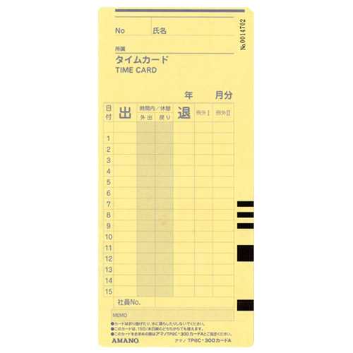 商品名 タイムカード Pro P@CKカード A 商品番号 Pro P@CKカードA 仕様 ■末締め・15日締め■入数:100枚 JANコード 4946267200646タイムレコーダー用のカード。職種に応じて締め日に合わせて選べます。