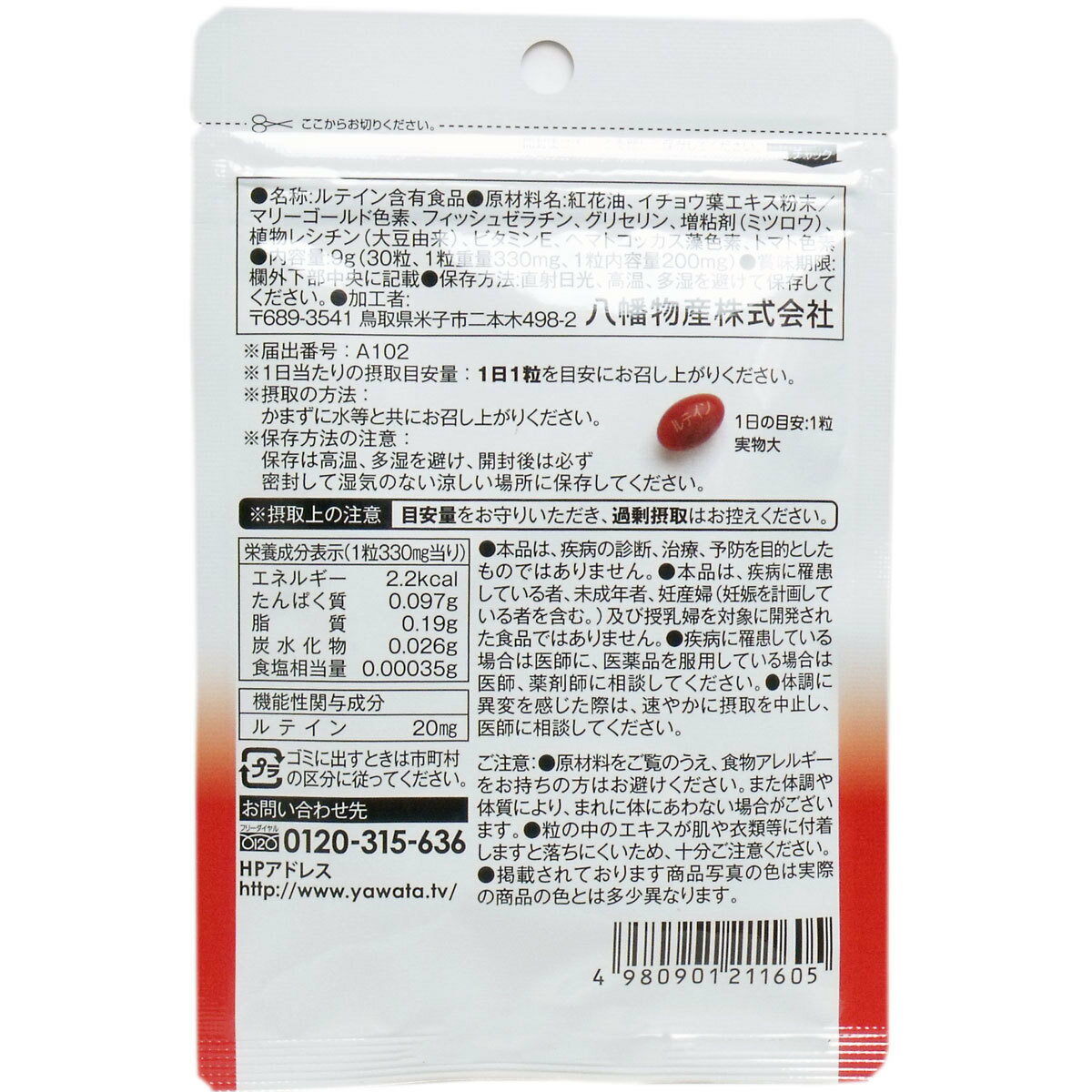 商品情報サイズ・容量個装サイズ:104X159X5mm個装重量:約15g内容量:9g(30粒、1粒重量330mg、1粒内容量200mg)【発売元:八幡物産株式会社】規格【ルテイン含有食品】【原材料】紅花油、イチョウ葉エキス粉末/マリーゴールド色素、フィッシュゼラチン、グリセリン、増粘剤(ミツロウ)、植物レシチン(大豆由来)、ビタミンE、ヘマトコッカス藻色素、トマト色素【栄養成分表示(1粒/330mgあたり)】エネルギー・・・2.2kcaLたんぱく質・・・0.097g脂質・・・0.19g炭水化物・・・0.026g食塩相当量・・・0.00035g【機能性関与成分】ルテイン・・・20mg【摂取目安量・方法】1日1粒を目安に、かまずに水などと共にお召し上がりください。【摂取上の注意】・目安量をお守りいただき、過剰摂取はお控えください。・本品は疾病の診断、治療、予防を目的としたものではありません。・本品は疾病に罹患している者、未成年者、妊産婦(妊娠を計画している者を含む)、および授乳婦を対象に開発された食品ではありません。・疾病に罹患している場合は医師に、医薬品を服用している場合は医師・薬剤師に相談してください。・体調に異変を感じた際は速やかに摂取を中止し、医師に相談してください。・原材料をご覧の上、食物アレルギーをお持ちの方はお避けください。粒の中のエキスが肌や衣類等に付着しますと落ちにくい為、十分注意してください。・掲載されております商品写真の色は実際の商品の色とは多少異なります。【保存方法】直射日光、高温多湿を避けて保存してください。広告文責株式会社Office Kanna TEL:082-847-2414やわた メラックス 目のサプリメント 1ケ月分 30粒入 目の調子を整える 目のサプリメント! 機能性表示食品(ルテイン含有食品)です。 ルテインには 目の黄斑部の色素量を維持する働きがあり、ブルーライトなど光の刺激からの保護や、コントラスト感度の改善(ぼやけの解消)によって、目の調子を整える機能があることが報告されています。<こんな方におすすめ>●パソコン作業が多い方●お手紙や手元作業が多い方●スマートフォンをよく使われる方●本や新聞をよく読まれる方 1