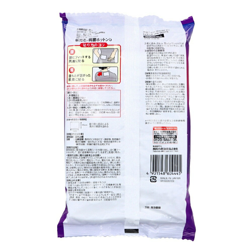 商品情報サイズ・容量個装サイズ:140X230X35mm個装重量:約254g内容量:7枚入製造国:日本【発売元:小林製薬株式会社】規格【医療機器】販売名:肩腰ホットンb医療機器届出番号:28B3X10011000050【使用上の注意】★使用方法等に関する使用上の注意・本品を使用した状態でさらに上から押さえつけたり、長時間圧迫しない。・コタツ、電気カーペット、電気毛布、湯たんぽ、電気アンカ等その他の暖房器具と併用しない。・熱いと感じたときに、すぐにはがせない状態での使用はさける。・運動時には使用しない。・厚みのある肌着を着用すると、温かさが感じられない場合がある。・肩に使用する際は、肌着の種類によっては、温熱シートが患部に当たらない場合がある。首もとが詰まった肌着を着用して使用する。・温熱シートの発熱が終了したらすぐにはがす。(低温やけどのおそれがある)★使用注意(次の方は慎重に使用すること)(1)皮フの弱い方(やけどになりやすい)(2)高齢者(生理機能が低下していることが多く、やけどすることがある)・重要な基本的注意・次の方は使用前に医師または薬剤師に相談する。(1)今までに薬や化粧品などによるアレルギー症状(例えば発疹、発赤、かゆみ、かぶれなど)をおこしたことがある方(2)貼り薬や塗り薬を使用する方(3)妊娠中の方・肌に赤み、かゆみ、痛みなどのやけどの症状がでたときはすぐに使用を中止し、皮フ科医等に相談する。・使用中の注意事項(1)低温やけど防止のための注意低温やけどは、体温より高い温度の発熱体を長時間当てていると紅斑、水疱等の症状をおこすやけどをいう。なお、自覚症状をともなわないで低温やけどになる場合もあるので注意する。(2)熱いと感じたときや異常が認められる場合は、すぐにはがす。★取扱い上の注意・保存状態により、表示の発熱時間に影響を与えることがある。・粘着剤で傷む肌着や高級な肌着には使用しない。・温熱シートをはがすときは、不織布部をつままずに粘着剤のない部分に指を入れてゆっくりとはがす。(貼りなおすと粘着力が低下する。)・食べられないので口に入れない。間違って飲み込んだときは、うがいをして医師の診断を受ける。・目に入った場合はこすらずすぐに流水で15分以上洗い流し、医師の診断を受ける。・捨てるときは、市区町村で定める区分に従う。・有効期間内に使用する。・使用目的以外に使用しない。その他の商品説明★禁忌・禁止1.再使用禁止2.肌に直接貼らない3.次の方は使用しない(1)自らの意思ですぐにはがせない方(2)糖尿病など、温感や血行に障がいのある方((1)(2)重度のやけどになることがある)4.次の部位には使用しない(1)粘膜、顔(目のまわりなど)(重度のやけどになることがある)(2)湿疹・かぶれ(3)傷口(4)打撲・ねんざ((2)~(4)症状が悪化することがある)広告文責株式会社Office KannaTEL:082-847-2414【ポイント10倍キャンペーン当店バナーよりエントリー必須】【選べる1~5個セット】血流改善 衣類に貼る 就寝ホットン 8時間持続 7枚入 温熱治療 貼るカイロ あったまる じんわり低温、医療温熱。 商品説明 就寝中に腰痛・肩コリを和らげる。●じんわりほぐす8時間継続。●日本製。【使用目的】温熱効果【効果】温熱治療・筋肉のこりをほぐす・神経痛、筋肉痛の痛みの緩解・血行をよくする・筋肉の疲れをとる・疲労回復・胃腸の働きを活発にする【使用方法】・使用直前に個包装から温熱シートを取り出し、はく離シートをはがして、肌に直接触れないよう、もまずに肌着に貼る。・貼り方のコツ腰:腰にフィットする肌着に貼る肩:首もとが詰まった肌着に貼る※予告なく成分・パッケージが変更になることがございます。予めご了承ください。 1