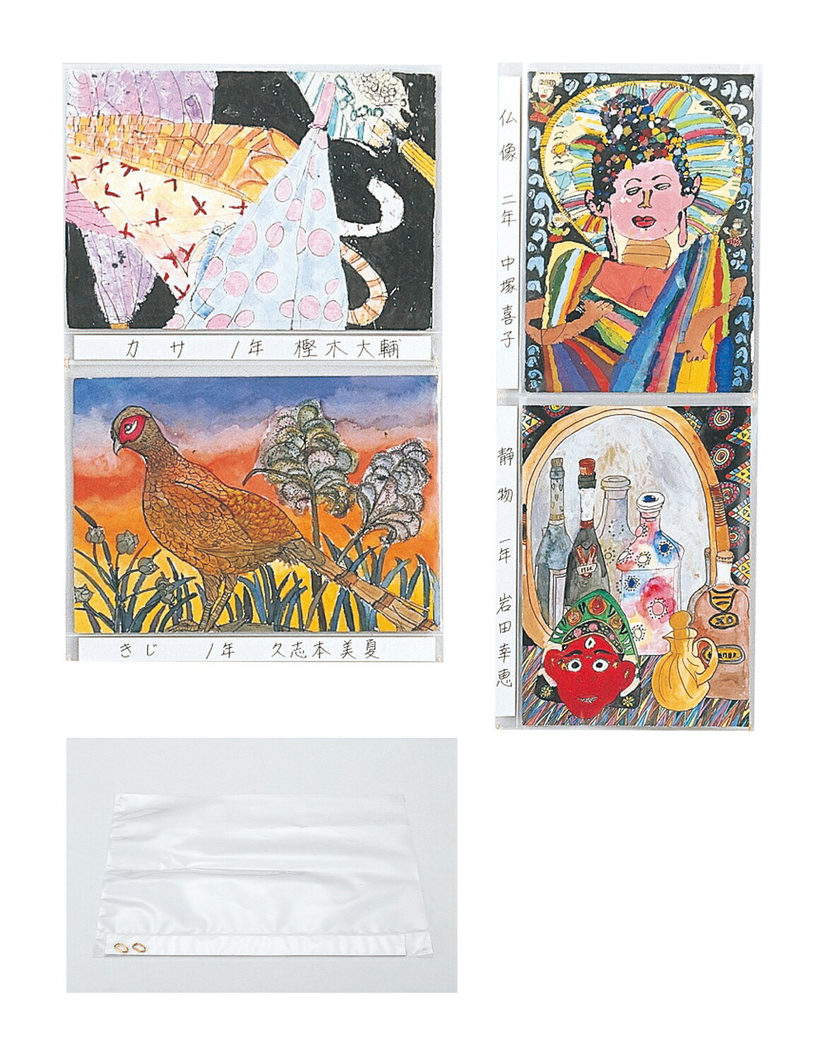 簡易タイプのビニール製、展示用吊り額縁です。穴アケ加工外寸:8切用(340×400mm)、4切吊りカン×2、名前カード×1絵の入るサイズ:380×270mm袋タイプの展示用吊り額縁ビニール袋入