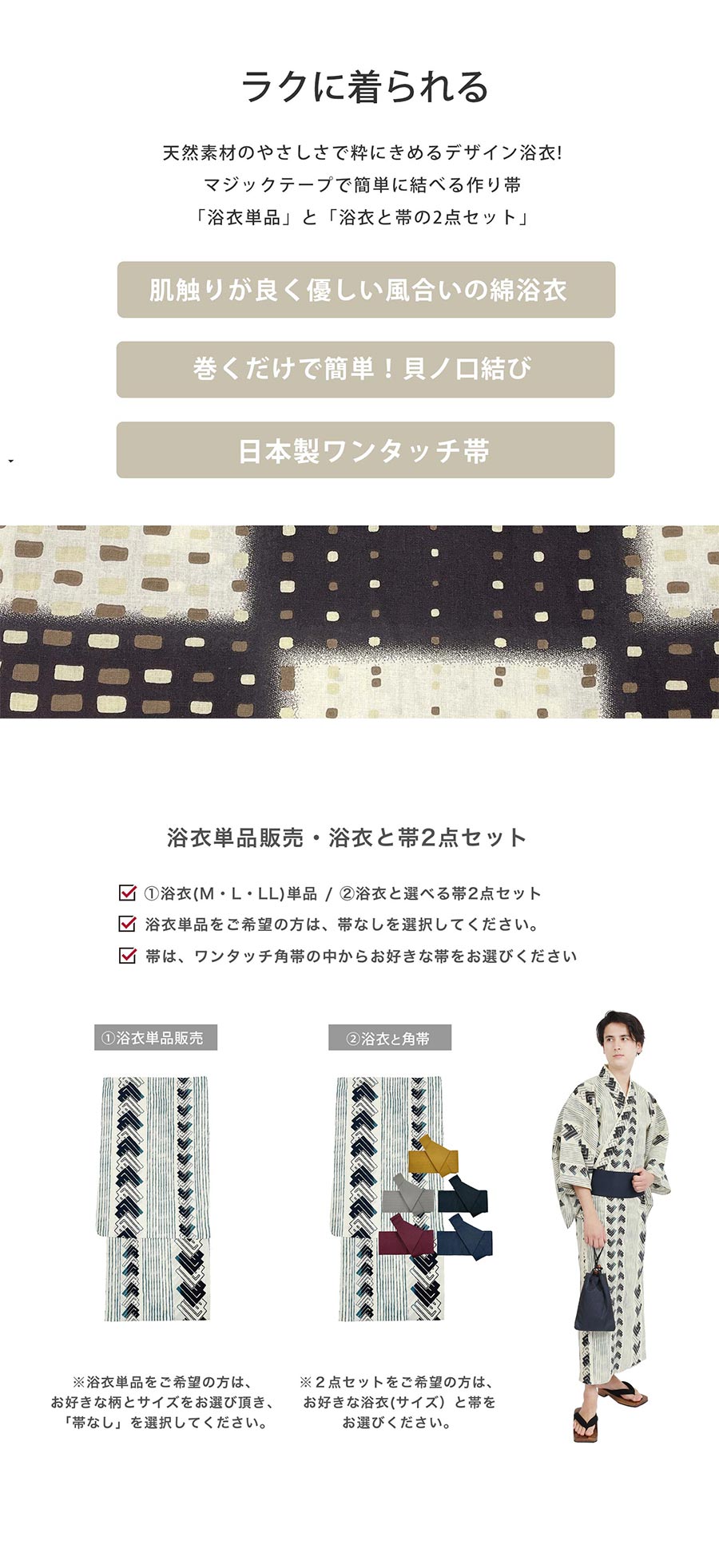 浴衣 単品/ワンタッチ帯セット メンズ 浴衣 帯 S M Lサイズ z32-01 | ゆかた ユカタ 男性 紳士 男物 紳士浴衣 綿浴衣 角帯 浴衣寝巻き 寝間着 部屋着 花火大会 納涼祭り 盆踊り お祭り 縁日 日本舞踊 演劇 稽古着