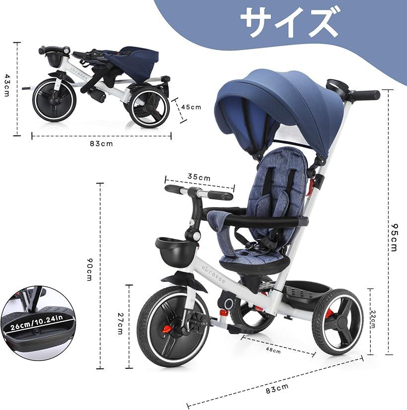 バリエーションコード : 2bu25hftlx商品コード2bu25hxx04商品名子供用三輪車 三輪車 カバー ベビーカー 手押し棒付き バイクブランドUBRAVOOカラーブルー「6IN1」三輪車はお子様の身長に合わせてサンシェード、ガードレール、コントロールバーを取り外したり、調整する事が可能です。10ヶ月~5歳までのお子様に対応しており、プレゼントにも最適です。「利便性」収納かご付き、必要な物を収納することができます。日差しからお子様を守るUVカット率99%以上のサンシェードは調節可能なで、どの方向からの日差しにも対応できます。「高い安全性」 1.ガードレールとシートベルトがついており、お子様を不慮の事故から守ります。2.三輪車の後部に付いているコントロールバーには進む方向を操作できる舵切り機能付き。3.後輪にブレーキが二個付いており、ブレーキかける際もっと穏やかで滑りなしで止まりロックされます。「耐用性良い」 車体には強度高い高炭素鋼を使用しており、安定した構造と強い耐荷重を実現しています。優れた耐衝撃性を発揮する高品質チタンエアタイヤは、耐摩耗性も良く、あらゆる路面にスムーズに対応することができます。「製品仕様」サイズ:95x48x83cm;対象年齢:10ヶ月~5歳; 重量:9.7kg。※ 他ネットショップでも併売しているため、ご注文後に在庫切れとなる場合があります。予めご了承ください。※ 品薄または希少等の理由により、参考価格よりも高い価格で販売されている場合があります。ご注文の際には必ず販売価格をご確認ください。※ 沖縄県、離島または一部地域の場合、別途送料の負担をお願いする場合があります。予めご了承ください。※ お使いのモニタにより写真の色が実際の商品の色と異なる場合や、イメージに差異が生じることがあります。予めご了承ください。※ 商品の詳細(カラー・数量・サイズ 等)については、ページ内の商品説明をご確認のうえ、ご注文ください。※ モバイル版・スマホ版ページでは、お使いの端末によっては一部の情報が表示されないことがあります。すべての記載情報をご確認するには、PC版ページをご覧ください。