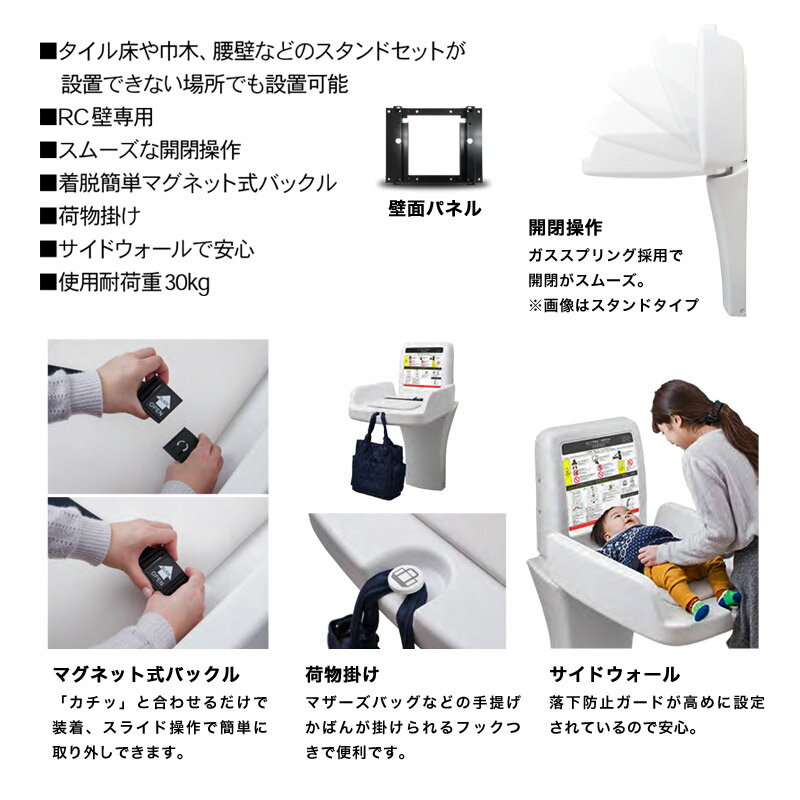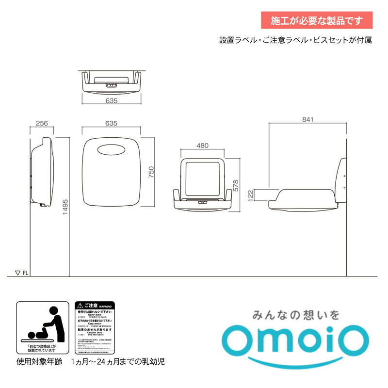 【重要なお知らせ】omoio(オモイオ)製品を購入頂く際のお願い・注意事項 こちらの商品は、施設向け商品の為、個人宅への配送は出来ません。 法人様でも配送先によっては配送不可 もしくは 別途送料が掛かる場合がございます。 注文時にご希望日の指定をお願いします。 (※平日のみ/時間指定不可) 車上渡しとなります。 (※ビルやマンション等への荷揚げも行えません) omoioではメーカー保証上、設置先情報(住所、施設名、電話番号)の登録が必要です。 ご注文者様情報と設置先情報が異なる場合は、備考欄に記載して下さい。 ※上記の注意事項をご了承の上、ご注文ください。※ご不明な点などございましたら、お気軽にお問い合わせください。 【omoio オモイオ】おむつ交換ベッド オムツっ子TS-V1-W(壁付タイプ) 軽量コンパクトな壁付け縦型のトイレスペース用おむつ交換台です。 両サイド防護壁の安全設計。落下防止のキャッチベルト付き。 >> Product / 製品情報 商品名 【omoio オモイオ】ウォールタイプ壁付縦型おむつ交換ベッドオムツっ子TS-V1-W 品番 TS-V1-W 仕様 材質/主材:ポリプロピレン・スチール・ウレタンフォーム・木合板 張材:ビニールレザー サイズ 収納時/ W635×D256×H750mm 使用時/ W635×D841×H578mm 商品説明 軽量コンパクトで施工が簡単なおむつ交換ベッドです。 ※使用対象年齢 1ヶ月〜24ヶ月までの乳幼児 両サイド防護壁の安全設計 施工が必要な商品です。 ビスセット、「設置シール」「ご注意シール」付属 配送 お支払い この商品は、メーカー直送となります。(代引き不可) お支払いは、「銀行振込・郵便振替・クレジット決済」のいずれかをご選択ください。 セット内容 おむつ交換ベッド本体 ビスセット 設置・ご注意シール ブランド omoio オモイオ スタンドタイプ壁付式 おむつ交換ベッド オムツっ子FA2 ウォールタイプ壁付式 おむつ交換ベッド オムツっ子FA2 スタンドタイプ 縦型おむつ交換ベッド オムツっ子 ウォールタイプ 壁付縦型おむつ交換ベッド オムツっ子 オムツっ子V1用クッションシートトップページ > パブリック(公共施設・商業スペース) > ウォールタイプ壁付縦型おむつ交換ベッドオムツっ子TS-V1-W トイレスペース用ベビー用品(ベビーシート)