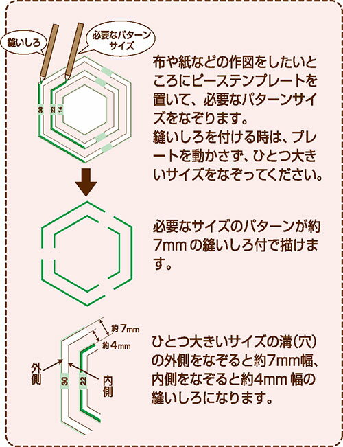 【商品の詳細】パターンと縫いしろが同時に描けるテンプレートです。サイズ数は13種です。ピースドキルトのお手伝い。お好きなサイズのパターン作れます。布や紙などの作図をしたいところにピーステンプレートを置いて、必要なパターンサイズをなぞります。ワンパッチなどの作品作りに便利です。【ご注文前に必ずお読み下さい】・表示価格は1パックの価格です。・ご覧になるディスプレイ環境により、実際のお色と異なる場合がございます。・予告なくパッケージが変更になる場合がございます。・当社の他オンラインショップと在庫を共有しており、注文が確定しても完売・欠品の場合があります。予めご了承下さい。