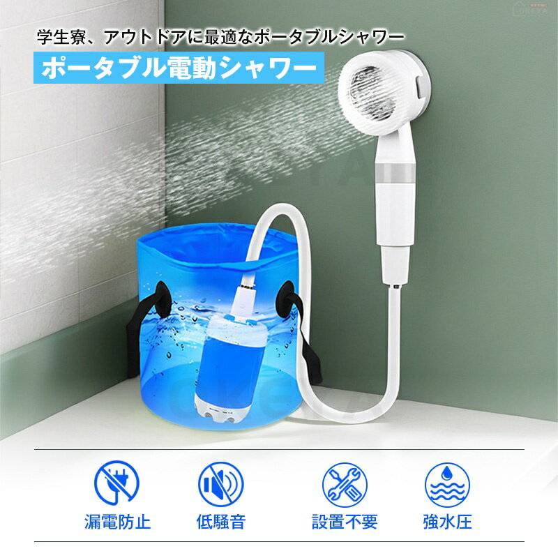 ポータブルシャワー ポータブル電動シャワー 5000mAh大容量 USB充電式 野外/屋内兼用 5L/分強水流 2段階水圧切替 手元ストップ機能 軽量 約1-2時間駆動 防漏電 低騒音 節水 バケツ給水対応 アウトドア