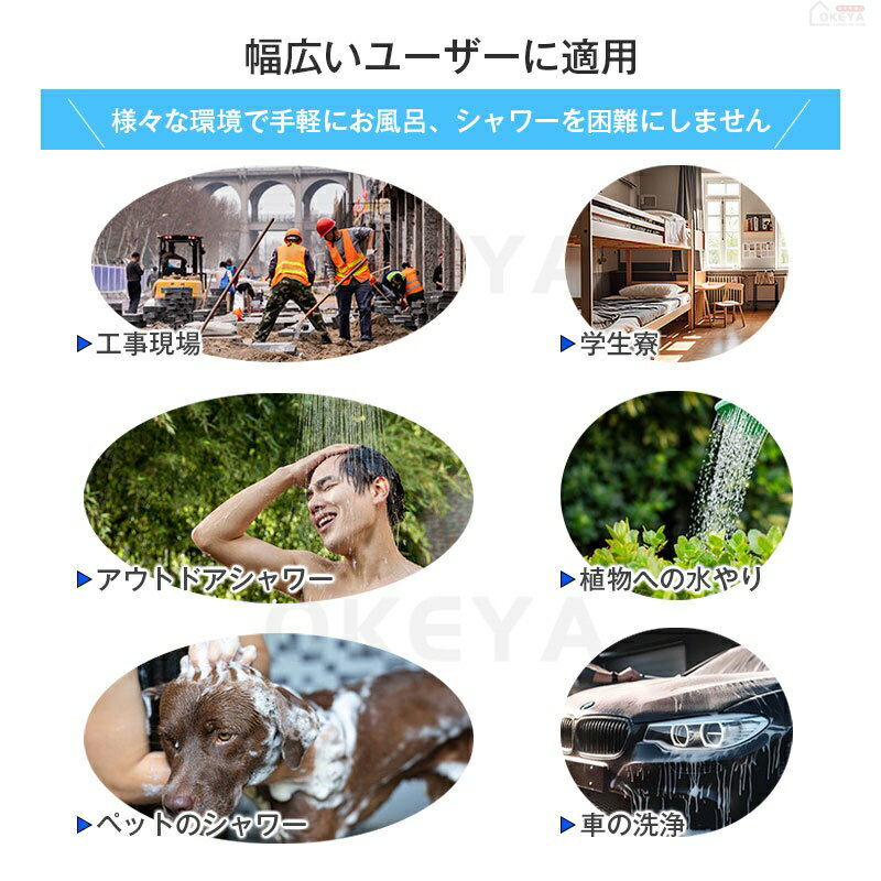 商品情報商品名ポータブルシャワー商品説明このポータブルシャワーは、アウトドアや屋内での使用に最適な電動シャワーです。5000mAhの大容量バッテリーを搭載し、USB充電式で手軽に使用できます。強力な5L/分の水流と2段階の水圧切替機能により、快適なシャワー体験を提供します。手元で水を止められる機能や防漏電設計により、安全性も確保されています。軽量で持ち運びが簡単、低騒音設計で静かに使用でき、節水効果も期待できます。バケツからの給水にも対応しており、キャンプや旅行での使用に便利です。素材ABS+PVCカラーホワイト全長205cm