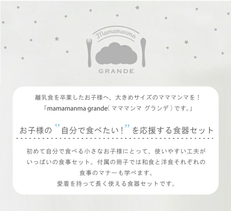 ▼ PICK UP BRAND ▼ Original Brand 【 emoka 】 赤ちゃんとママ・パパの為に かけがえのない、抱っこの《とき》Carry me!plus ひっくり返らないベビー食器 ezpz あそびから未来を変える BorneLund商品説明 【人気のマママンマのグランデセット+シリコンビブ+シリコンマットをセットに】 お子様の「自分で食べたい!」を応援する食器セット グランデセットにあう淡いグレーのお食事マット お手入れが簡単なシリコン製のビブ 大きなお皿、おちゃわん、スープわん、コップ等キッズが使える食器セットです。 ごはんを集めてすくいやすい設計のくもプレート。 洋食の時は高台にストッパーを装着して、すべらない様に。和食の時には、みみを両手でしっかり持ってお食事が出来る、みみ付きスープわん。 フチに厚みをもたせ、お子様の手に引っかかるようにしたおちゃわん。 蓋の小さな穴から飲み物が少しずつ出てきて、コップの練習が出来る、トレーニングふた付きコップ。 上記にフォークとスプーンの付いた、7点セットです。 抗菌・抗ウイルス・防カビ効果のある竹粉配合のバイオマスプラスティック製。 耐熱温度は-30℃〜140℃で、電子レンジや食器洗浄機で使うことができます。(スチーム殺菌や煮沸消毒はできません) 専用ボックス入りです。 シリコン製のビブは首周りのひもは布製マルチクリップ、エプロン部分はシリコーン製のセパレートタイプのお食事シリコンビブ。 淡いパステルカラーで、マママンマシリーズの食器とお揃いでお使いいただけます。 【ご案内】 ※天然素材である竹を使用しているため、商品の色合いに個体差があります。 同じセットの中でも、アイテムにより色の濃淡が微妙に違ったり、色ムラなどがある場合がございます。 これらは素材由来によるもので、不良ではございませんので、ご理解・ご了承ください。 ※茶色や黒っぽい斑点が見える場合がございますが、原材料である竹の一部です。自然なものなので、一切害はありません。 グランデセット 【サイズ(約)】 1.くもプレート:横26.8×縦13.8×高さ3.5cm 2.みみ付きスープわん:横13.9×縦10.7×高さ5cm 3.おちゃわん:直径10×高さ5.2cm 4.トレーニングふたつきコップ:横12.9×縦7.2×高さ6.6cm(ふた無しの時) 5.スープわん・おちゃわんストッパー:直径7×高さ1cm 6.フォーク 7. スプーン:長さ12cm 【素材】 竹粉配合樹脂(抗菌効果・抗ウイルス・防腐効果) コップトレーニングふた、スープわん・おちゃわんストッパー:ソフトエラストマー 詳細はこちら>> シリコンビブ 【サイズ(約)】 ビブ本体:高さ 約19×幅 約22.5cm マルチクリップ:全長 約23cm 【素材】 ビブ本体:シリコーン マルチクリップ生地:ナイロン100%(撥水撥油加工) マルチクリップ中材:ポリスチレン クリップ:ポリカーボネイト 詳細はこちら>> シリコンマット 【サイズ(約)】 約35×45cm ポケットの溝の深さ:3.5cm 【素材】 シリコーン 【耐熱温度】 230度 詳細はこちら>> メーカー フィセル ブランド 10mois(ディモワ) 注意事項 ・ラッピングは商品ごとの個別包装となります。 ・特典は個別包装となります。 ・商品ご使用の際は、詳細情報について必ず取扱説明書をご確認の上ご利用ください。 ・返品・交換の場合は、必ず事前にご連絡ください。 ・お客様都合による商品の返品・交換についての送料・手数料はお客様のご負担でお願い致します。 ・開封後の返品・交換は不可となります。 納品書(お買い上げ明細書) 環境保護の観点からペーパーレス化の取組の一環として、商品に【納品書(お買い上げ明細書)】の同梱を廃止させていただいております。 納品書をご入用の際は、メールまたは備考欄にて【 納品書希望 】とご連絡を下さいますようお願い申し上げます。
