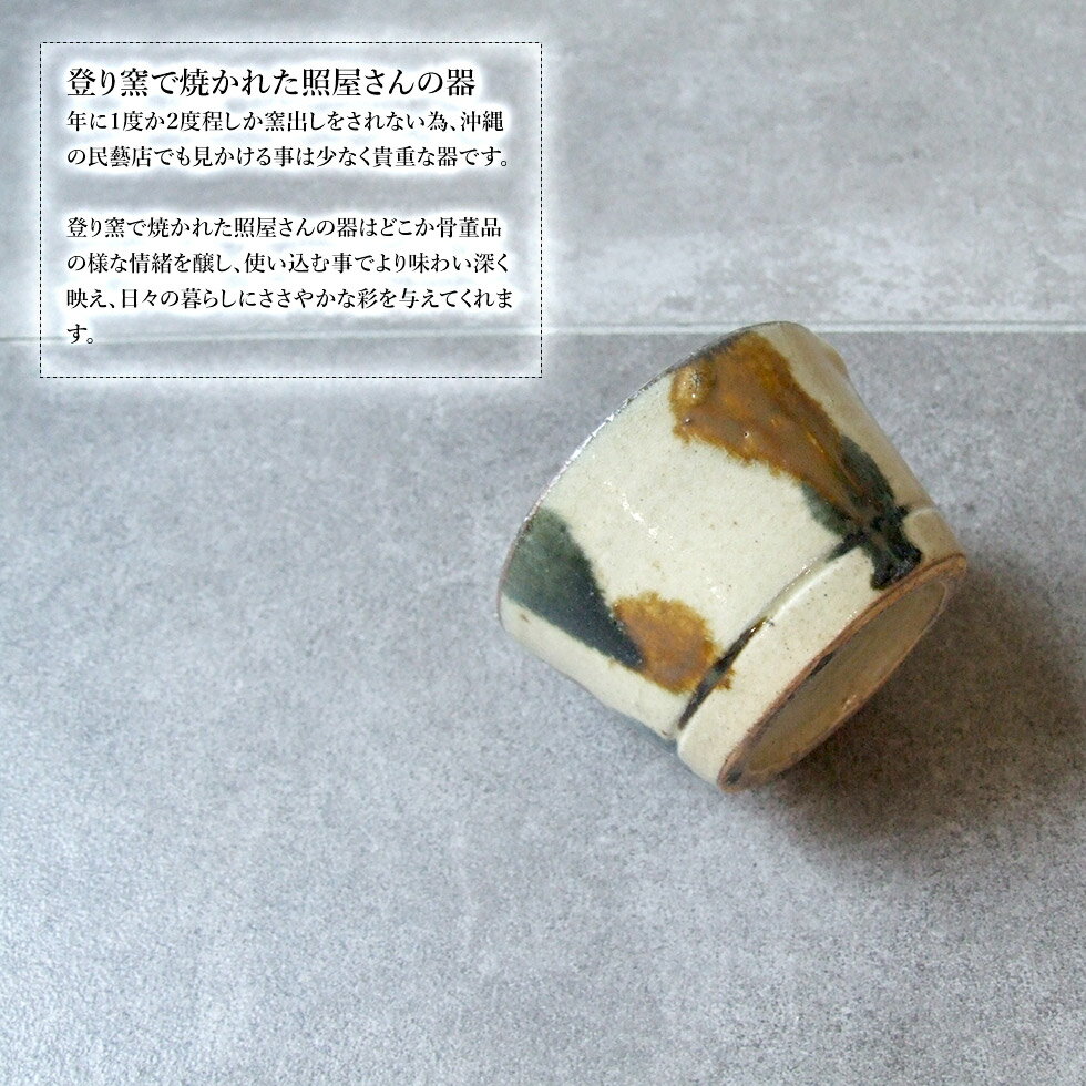 やちむん 民藝 照屋窯 照屋佳信 そば猪口 呉須に飴 点打ち 照屋佳信さんのやちむん 照屋さんの器と私の出会いは地元の沖縄料理店でした。荒々しく素朴で温かみのあるその雰囲気に料理が冷めるのも忘れしばらく見入っていました。店主に作られた方の名前を聞き、それが照屋さんの器だと知りました。 照屋佳信さんは1950年生まれ。壷屋のもっとも伝統的な窯である、小橋川永昌さんの仁王窯で修行後、恩納村に照屋窯をひらかれた現代の名工です。 照屋窯は沖縄県恩納村の山の中にあり、大自然に囲まれ家族で作陶されています。 年に1度か2度程しか窯出しをされない為、沖縄の民藝店でも見かける事は少なく貴重な器です。登り窯で焼かれた照屋さんの器はどこか骨董品の様な情緒を醸し、使い込む事でより味わい深く映え、日々の暮らしにささやかな彩を与えてくれます。 実際お会いしてみて、寡黙で温和な人柄の照屋さんときっちりしっかりした奥様の絶妙のバランスに益々照屋さんの事が好きになるのでした。 その時にお分け頂いた貴重な器達。当店に入荷分は少しのヒビや歪み、焼きがあまめのものがあったりと少々訳あり品となっております。 日々お使い頂くには問題ございませんが、お気になされる方は上記を踏まえご検討下されば幸いです。 こちらは可愛らしいサイズ感のそば猪口です。 登り窯で焼かれた照屋さんの器 年に1度か2度程しか窯出しをされない為、沖縄の民藝店でも見かける事は少なく貴重な器です。 登り窯で焼かれた照屋さんの器はどこか骨董品の様な情緒を醸し、使い込む事でより味わい深く映え、日々の暮らしにささやかな彩を与えてくれます。 ポイント 照屋窯 照屋佳信 1968年 小橋川永昌氏に弟子入り 1985年 恩納村に照屋窯を開く 高江洲康宣奨励賞など受賞多数。 素朴で大胆な器はファンも多く現代の名工の一人として知られています。 食卓を彩る 大胆な絵付け、どっしりとした存在感。 見ているだけでわくわくする様な器たちはどんな料理でもよく合い食卓を華やかに彩ってくれます。 8寸皿ならパスタにカレー、来客時に尺皿でオードブルを盛りつけたり。日々使うことでやちむん本来の美しさを感じさせてくれます。 人と自然が作る 絵付け等の技法はもちろん土の質や釉薬の種類、その年の天気や湿度等によって仕上がりが変わってきます。 人が制御しきれない自然まかせのもの作りにやちむんの魅力が詰まっています。大量生産の工業製品とは違い、すべてが一点ものの様相を醸すやちむんにファンが多いのはそのための様に感じます。 商品の詳細 やちむん 民藝 照屋窯 照屋佳信 そば猪口 呉須に飴 点打ち 素材陶器 サイズ直径9cm 高さ6cm 生産地日本(沖縄県 照屋窯2024.06) 注意事項 ●やちむんは昔ながらの伝統的な製法、受け継がれた手仕事により作られているのでムラや歪み、釉薬の跡、ヒビ、焦げ、灰の付着等の可能性があり同じ大きさ、絵付けでも個体により少しずつ異なります。やちむんの持つ個性とご理解頂ければ幸いです。 ●電子レンジ、オーブン、食洗機の使用はお避け下さい。 ●使用後は中性洗剤で洗い、十分に乾かした後に食器棚にしまって下さい。水分の残りはシミや臭いの原因になります。 ●器の内側にある白い輪(蛇の目)は重ねて焼く時に生まれ、一番上で焼かれた器には蛇の目はありません。同じ器でも蛇の目のある物、無い物がございますので予めご了承の程宜しくお願い致します。 ●照屋さんの器に関しまして当店に入荷分は少しのヒビや歪み、焼きがあまめのものがあったりと少々訳あり品となっております。箇所は画像に掲載しておりますが、詳しくお知りになられたい方はお気軽にお問い合わせ下さい。