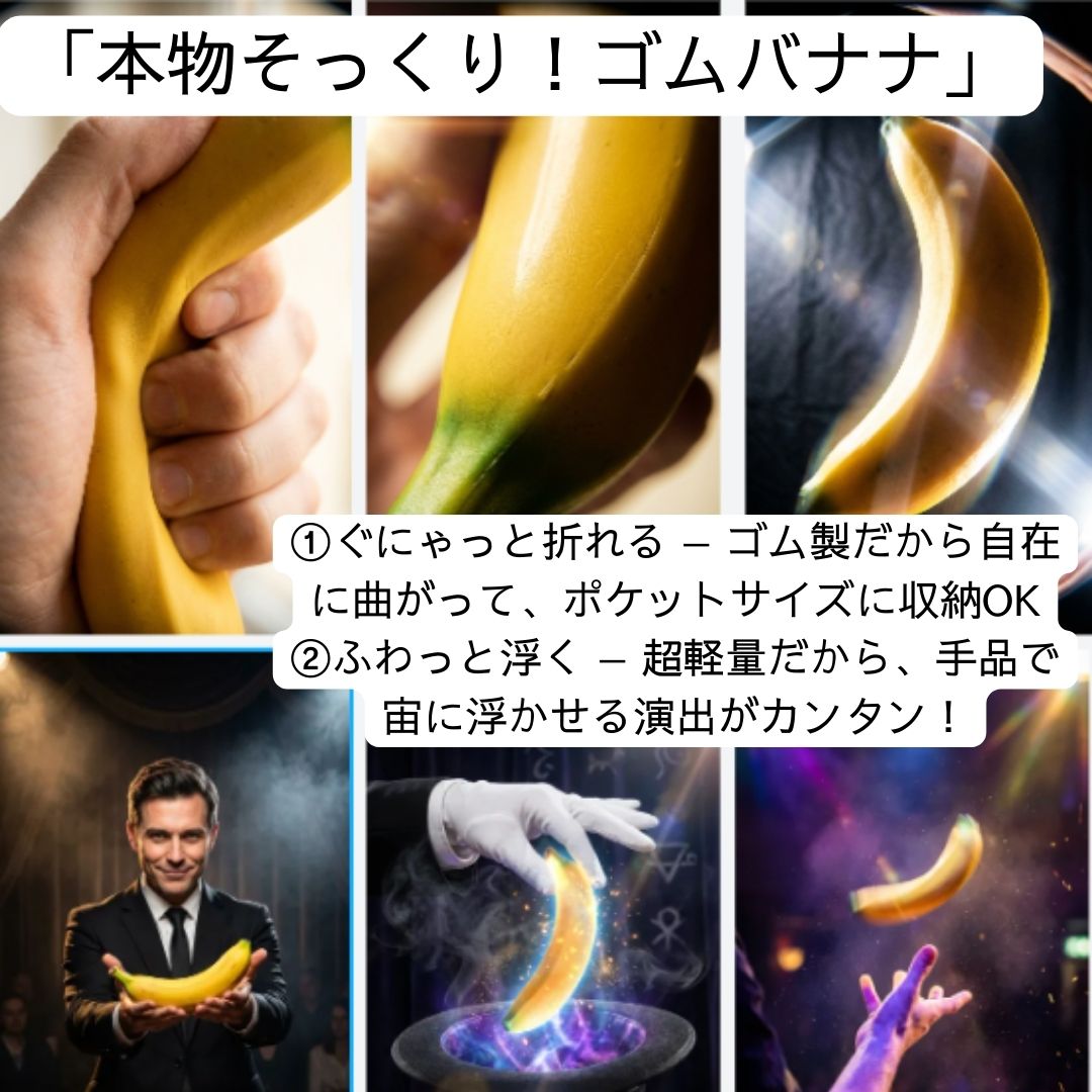 【ゴムバナナ】ギャグマジックにお使いください。ゴム製なのでかなり小さくなります.超リアルなゴム製のバナナ!! ステージでもクロースアップでも使用出来る。 ゴム製で拳の中に入るように小さくなります!! 約1m離れた所では、区別がつきません。 瞬間的に広がるようになっています。 【使った感想】一瞬で大きくさせるのもありですが、きれいな手順が好きならさりげなく取り出すとか、ハンカチの下から取り出すなど出現する瞬間を見せないほうが不思議に見えますね。本物と取り換える手順も試してみたいです。 【動画解説付】初心者向けに手品の種明かし、やり方説明をした動画説明が付録で付きます。封入されてないときはメッセージいただければ動画を配布します。 【現品撮影・国内発送】現物撮影+検品+補修。海外製造ですが、国内のスタジオで日本人のカメラマンが現物で商品を撮影、スタッフが出荷時に検品と補修。万が一国際便での発送の場合は全額返金して商品は無償で差し上げます。 【仕様】16cm、サムチップ詰められるぐらいまで小っちゃくなります。一瞬で大きくなります。3個セット