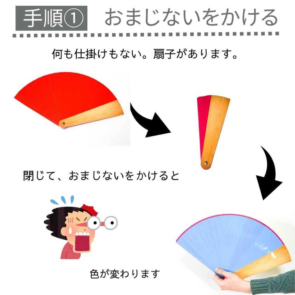 "【 扇子が4色に変化する!? 】 マジック扇子は、その名の通り「マジック」・「手品」用のアイテムとなっております。1個の扇子が4色に変わり、見る人全員を驚かすこと間違いなし!また、扱い方法も簡単で小さいお子さんも使用可能となっております。 " "【 盛り上げたいときに! 】 忘年会や結婚式の2次会など、盛り上げたいときに「何をすればいいか」わからなくて困るときございませんでしょうか?マジックができると注目されるようになります。異性からもてるケースもあります。また宴会の人気者になるので、自分の存在感が以前よりもアピールしやすくなるので、マジック扇子は、盛り上げたいときのアイテムとして最適です。 " 【 練習いらず! 】 マジック扇子は、開くだけで色が変わる仕組みとなっております。練習の必要がない為、小さいお子さんもお手軽に使用可能となっております。幼稚園のクリスマス会など、行事の出し物としてもお使い可能です。定番のカードマジックやコインを使ったマジックは、練習が必要なため習得するまで時間がかかります。マジック扇子は子供から大人までお手軽に使用可能です。是非、お試しくださいませ♪ 説明動画が付きます。通常の説明書では分かりにくい手順を動画で説明します。よくある中国語や英語の説明ではなく、プロマジシャン制作の分かりやすい動画です。動画アドレスは同封の用紙に記入しております。万が一、PCの環境により動画にアクセスできない等の問題がありましたらご連絡ください。お届けする商品の中に動画のアクセスアドレスを書いた用紙が入っております。 長さ25cm、広げた長さ46cmのファン! 広げる度、黄色・青・赤・緑に変化します。 解説書なくてもやりかたがわかります 4個セット