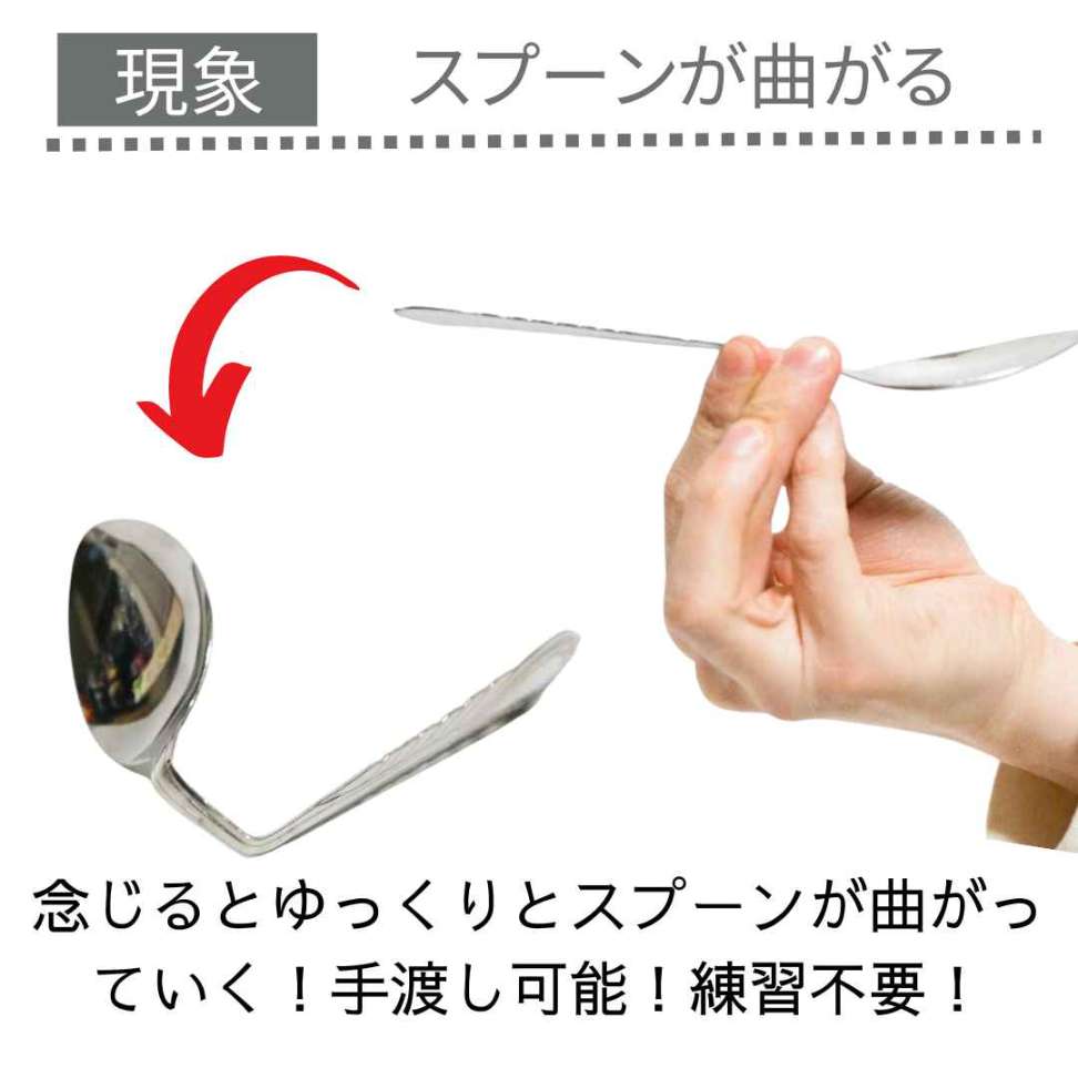 "現象:マジシャンは金属製のスプーンの首の部分を指先で持ちます。 他の指は一切スプーンに触れません。 そして念を送ると、なんとスプーンは反り返るようにゆっくりと勝手に曲がり始めるのです。 計上記憶合金や特殊な薬品は使いませんし、使い捨てでもありません。 スプーン曲げ用のギミックと、解説のセットです。 " "説明動画が付きます。通常の説明書では分かりにくい手順を動画で説明します。よくある中国語や英語の説明ではなく、プロマジシャン制作の分かりやすい動画です。動画アドレスは同封の用紙に記入しております。万が一、PCの環境により動画にアクセスできない等の問題がありましたら、当店にご連絡ください。お届けする商品の中に動画のアクセスアドレスを書いた用紙が入っております。 " "テクニックなしでスプーンが自動的にゆっくりと曲がります。 ギミックに使われているパーツとペンチがあれば、スプーン曲げに良く使われる百斤のスプーン自作で同様のギミックを自作できます。 "