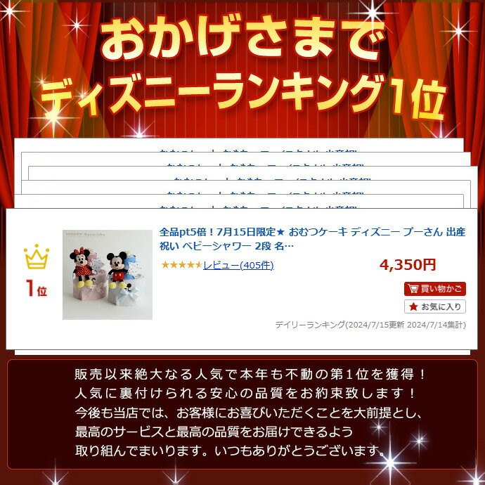 紙おむつのメーカーと枚数 「パンパース」 「ムーニー」 「メリーズ」 「GOO.N」 テープSサイズ御選択時:13枚 テープM・Lサイズ御選択時:11枚 パンツタイプ御選択時8枚 ☆目安☆ Sサイズ(4-8kg) Mサイズ(6-11kg) Lサイズ(9-14kg) おむつケーキのサイズ 直径約20cm×高さ約25cm(ラッピング前) このおむつケーキの装備アイテム ■ディズニーぬいぐるみ1つ ※アイテムのデザイン・サイズ等は時期により変更される事があります。常に最新状態でお送りいたします。 予めご了承下さいませ。 ■ディズニーキャラクタータオル(刺繍対応可能) ■メッセージカード ギフト対応 ※リボンの色や柄は時期により多少異なる場合がございますのでご了承ください。