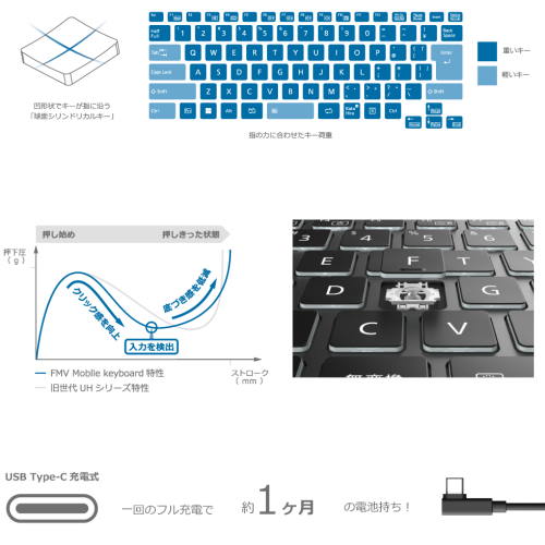 ■Bluetooth対応コンパクトモバイルキーボード■バックライトキーで暗所でも見やすい■マウスいらずのフラットポイント(タッチパッド)FMVNKBURカラー:ダークシルバー有線/無線:無線/有線両対応ケーブル長:約1mインターフェース:Bluetooth5.0/USB2.0 Type-Cキー入力方式:N/Aキー配列:OADG 109A準拠配列(テンキーレス86キー)キーピッチ:約19mmキーストローク:約1.5mm電源: 充電式 単0形乾電池 0本()寸法:幅 303×高さ 11×奥行 162mm質量:約338g付属品: USBケーブルTypeA-TypeC(1m) USBケーブルTypeC-TypeC(1m) 取扱説明書至極の文字入力