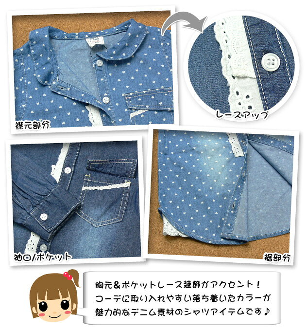 【送料無料】【女児キッズ】【シャツ】Donkey Jossy 胸元レース装飾付 長袖デニムシャツ【100cm】【110cm】【120cm】【メール便対応】