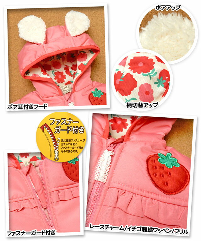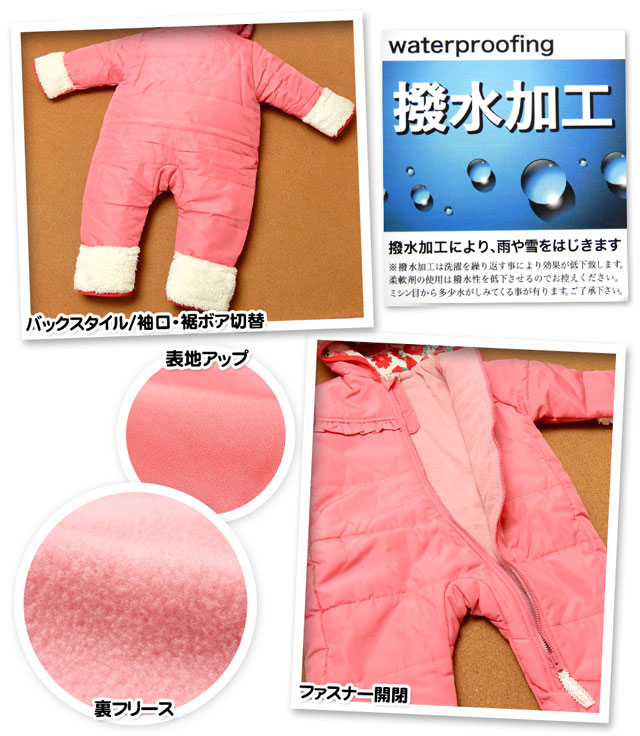【送料無料】女児 ベビー 裏フリース カバーオール あったか素材 おくるみコンビ 中綿 撥水加工 ミトン ボア耳付きフード 前開きファスナー ベビー服 女の子 70cm 80cm 90cm a-1502