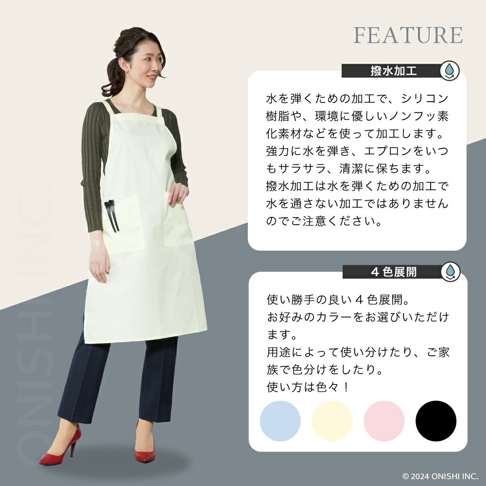 抜群の撥水加工!軽くて体にフィットするエプロンです。 【撥水加工】 水を弾くための加工で、シリコン樹脂や、環境に優しいノンフッ素化素材などを使って加工します。 強力に水を弾き、エプロンをいつもサラサラ、清潔に保ちます。 撥水加工は水を弾くための加工で水を通さない加工ではありませんのでご注意ください。 【4色展開】 使い勝手の良い4色展開。 お好みのカラーをお選びいただけます。 用途によって使い分けたり、ご家族で色分けをしたり。使い方は色々! 種類は首掛けタイプ、たすき掛けタイプの2種類よりお選びいただけます。 首かけタイプ > 首にひもがかかるので肩ひもがズレる心配がありません。 たすきがけタイプ > 背中部分がしっかりと固定されるので安定感があります。 ●送料についてのご注意 【送料無料商品】と【送料有料商品】を同時にご購入いただいた場合、【送料有料が優先】となります。 ご了承いただきますよう、よろしくお願い申し上げます。 製品名 WAKO(ワコウ) 撥水エプロン 素材 / 加工 ポリエステル65%・綿35% 撥水加工 サイズ 90cm(前身丈)×65cm(幅) カラー ブルー・クリーム・ピンク・ブラック タイプ 首かけタイプ・たすきがけタイプ 注意事項 ●お使いのモニター・液晶の設定や照明など、ご覧いただいている環境により実際の色味と異なって見える場合がございます。 ●パッケージやデザインが予告なく変更になる場合がございます。ご了承ください。