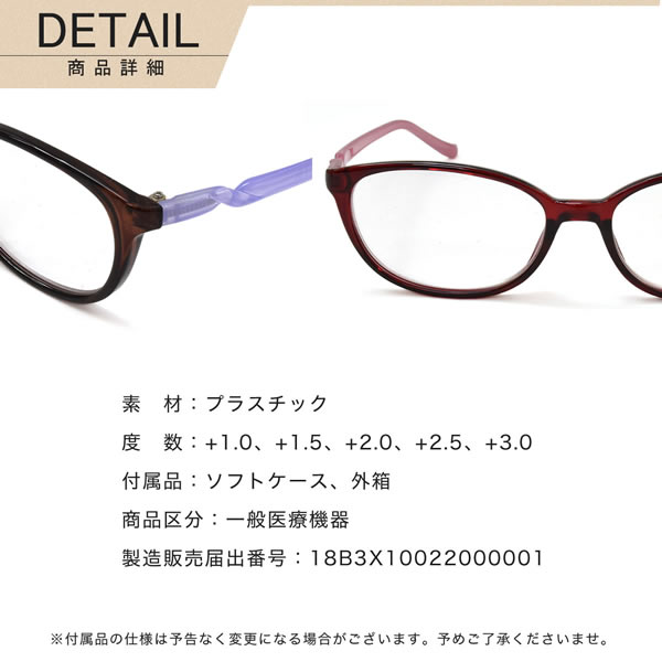 商品基本情報商品カテゴリー:老眼鏡・シニアグラス型番:FLL-002商品区分:一般医療機器製造販売届出番号:18B3X10022000001フレームカラー:全2色(クリアワイン/ミルキーピンク、クリアブラウン/ミルキーラベンダー)レンズカラー:--重量:(フレーム)約22g、(ケース)約10g度数:+1.00,+1.50,+2.00,+2.50,+3.00鼻パッド:なしレンズシェイプ分類:ボストンフレームタイプ分類:フルリムフレーム材質:プラスチックレンズ材質:--おすすめの性別:レディース-----------------------------------------------おすすめの性別:女性にオススメです。-----------------------------------------------付属品:ソフトケース W約170mm×H約70mm※付属品の仕様は予告なく変更になる場合がございます。予めご了承くださいませ。状態:新品未使用正規品こちらの商品は送料無料の対象外となります。送料無料商品と一緒にご注文いただいた場合は送料無料でお届けします。商品サイズ情報【A】レンズのよこ幅:52mm【B】レンズのたて幅:35mm【C】ブリッジ幅:17mm【D】全体のよこ幅:135mm【E】全体のたて幅:39mm【F】テンプルの長さ:138mmメーカー公表サイズ:-- アセテートのボストンフォルムが老眼鏡初心者の30代・40代でも扱いやいやすいリーディンググラスです。落ち着いたフロントカラーにテンプルのパステルカラーがかわいい仕上がりで、鼻パッドを高めに設計しフィット感にもこだわりました。 クラフトカラーのお洒落な外箱と、専用ソフトケースが付属しており、母の日や敬老の日などのプレゼントにもおすすめのアイテムです。