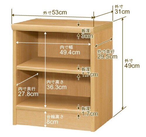 固定棚のない全棚板可動のフルオープン構造 本棚 A4ファイル、雑誌、書籍の大量収納に最適 当店独自の全棚板移動1.5cmピッチが選べます 低ホルムアルデヒド F★★★★サイズ奥行31cm×高さ49cm×幅53cm側板(内寸)28.2cm側板(外寸)29.5cm有効内寸幅外寸幅−(マイナス)3.6cm材 質プリント紙化粧繊維板塗 装ウレタン樹脂塗装棚 板厚さ17mm移動棚1枚左の移動棚と可動固定棚の違いを参照棚 板耐荷重左の耐荷重基準値表を参照棚 板奥行27.8cm奥行31cm×高さ49cm×幅53cm