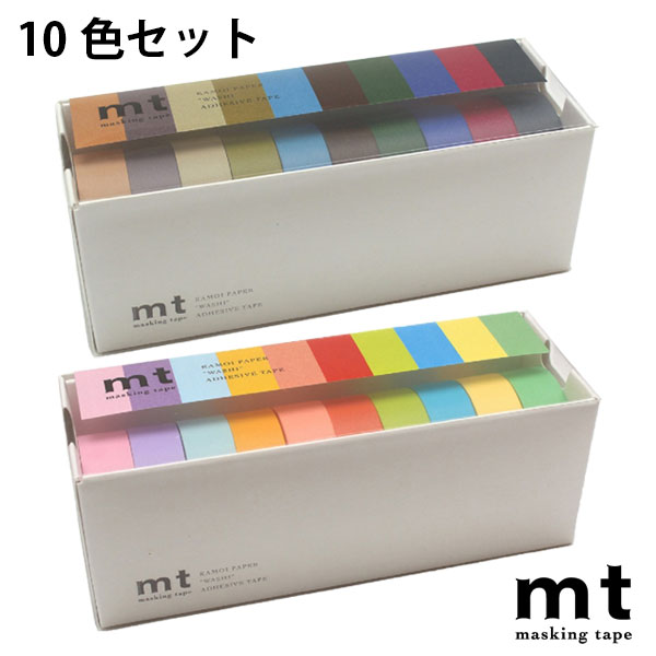mt 10色セット 明るい色2 15mm×7m 品番:S22196 入数:10 サイズ:幅 15 mm × 長さ 7 m カラー:ローズピンク、ラベンダー、人参、サーモンピンク、若苗、若緑、ベビーブルー、みず、たまご、ひまわり パステル系の明るい色味のベーシックカラーフルセットです。