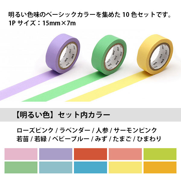 mt 10色セット 明るい色2 15mm×7m(ローズピンク ラベンダー 人参 サーモンピンク 若苗 若緑 ベビーブルー みず たまご ひまわり)