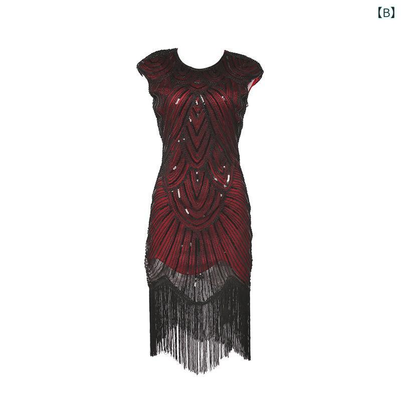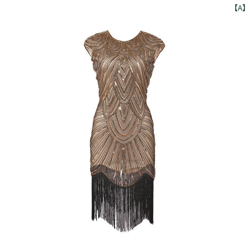 ドレス レディース レトロ ヴィンテージ風 スパンコール フリンジ ビーズ装飾 ゴージャス イブニングドレス 半袖 Uネック ローウエスト 結婚式 二次会 パーティー 謝恩会 披露宴 発表会 ゴールド