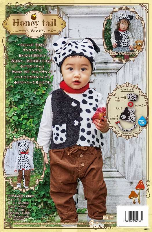 普段着にアニマルモチーフを落とし込み、モノトーンやくすみカラーなど色味にもこだわった新シリーズ「Honey tail(ハニーテイル)」。全ての愛するかいじゅうたちへ。SNSアンケートをとりながらママがほしい!着せたい!を形にしました。ちょこんと折れた耳が可愛いダルメシアン柄ベレー帽は耳中がベビーピンク。後ろがゴムになっているので脱げにくいのも嬉しいポイント。首輪をイメージしたもこもこチョーカーが差し色に!ベストはダルメシアン柄のくるみボタンにポケット付き。しっぽはボタン仕様で取り外しが可能!裏地は綿100%で肌触りも柔らか。ベレー帽もベストも単品コーデが楽しめます。チュールスカートを合わせたレディなコーデもオススメです。 【セット内容】ベレー帽、チョーカー、ベスト、しっぽ【素材】生地/ポリエステル100%、裏地/綿100%【洗濯表示】洗濯機不可、弱い手洗い可、塩素系漂白剤による漂白不可、アイロン不可、ドライクリーニング不可【商品サイズ】袋入りパッケージ有(W260×H390×D50mm)【総重量】175g【対応サイズ】80/1〜2歳目安、身長 80〜90cm、B 〜50cm、W 〜50cm【メイン部分の長さ(着丈等)】ベスト29cm【開き】ベスト/前ボタン【モデル身長】80cm【モデル着用サイズ】80〜90【バスト実寸】62cm【ウエスト実寸】-【ヒップ実寸】-【肩幅実寸】21cm【袖丈実寸】-【股下実寸】-【モデル名】-【その他のパーツ情報】頭囲44〜50cm、チョーカー32cm、しっぽ34cm【裏地の有無】ベスト部分、ベレー帽のみ有り【商品についての注意事項】装飾部分の引っ掛かりや巻き込みに十分ご注意ください。保護者同伴でのご使用をお願い致します。装飾パーツを口に入れることの無いようご注意ください。就寝時のご使用はお止めください。※生産時期やロット、デザインによって、多少サイズ・色・柄が異なる場合があります。摩擦や水濡れにより色移りする恐れがありますのでご注意ください。※商品画像は可能な限り実物の色に近づくよう調整しておりますが、お使いのモニター設定、お部屋の照明等により実際の商品と色味が異なって見える場合がございます。又、同じ商品の画像でも、撮影環境によって画像の色に差異が生じる場合がございます。【必ずご確認ください!】※ビニール開封後の商品は、不良品の場合を除き、返品・交換ができません。商品到着後に必ず、すぐにご確認ください。不良品の場合は1週間以内にご連絡いただかないとご対応ができなくなります。(ご不明な点は、お気軽にお問い合わせ下さい)※商品のデザインは、多少変更される場合があります。掲載写真の色は、実際の商品と多少異なって見える場合があります。【ご注意】弊社は楽天市場内で複数店舗運営しております。弊社運営の店舗で同じ商品をご購入の場合は、在庫が不足する場合があります。