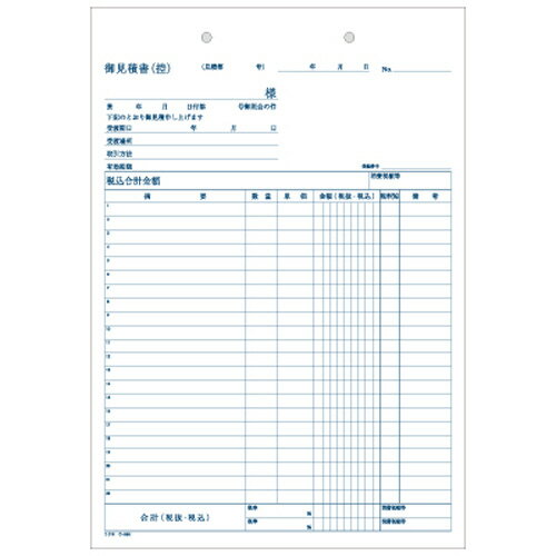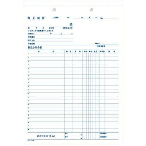 ●仕様/見積書、2枚複写、ノーカーボン複写、A4タテ●行数/22行●サイズ/タテ303×ヨコ210mm●とじ穴/2穴(幅80mm)●1パック=40組×10冊入※2019年10月1日から施行される軽減税率制度対応商品を順次出荷しております。新仕様・旧仕様のご指定は承っておりません。●メーカー/コクヨ●型番/ウ-386●JANコード/4901480021683※メーカー都合によりパッケージ・仕様等が予告なく変更される場合がございます。ご了承ください。本商品は自社サイトでも販売しているため、ご注文のタイミングにより、発送までにお時間をいただいたり、やむをえずキャンセルさせていただく場合がございます。※沖縄へのお届けは別途1650円(税込)の送料がかかります。