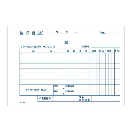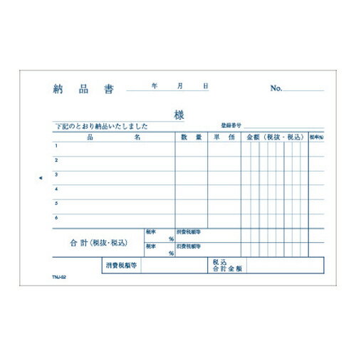 ●軽減(複数)税率対応、ノーカーボン・A6ヨコ型・3枚複写の納品書。10冊セットです。●仕様/納品書、A6ヨコ、3枚複写(受領付)、ノーカーボン複写●サイズ/105×154mm●行数/6行●1セット=50組×10冊入●メーカー/オリジナル●型番/TNJ-52●JANコード/4571347158243※メーカー都合によりパッケージ・仕様等が予告なく変更される場合がございます。ご了承ください。本商品は自社サイトでも販売しているため、ご注文のタイミングにより、発送までにお時間をいただいたり、やむをえずキャンセルさせていただく場合がございます。※沖縄へのお届けは別途1650円(税込)の送料がかかります。