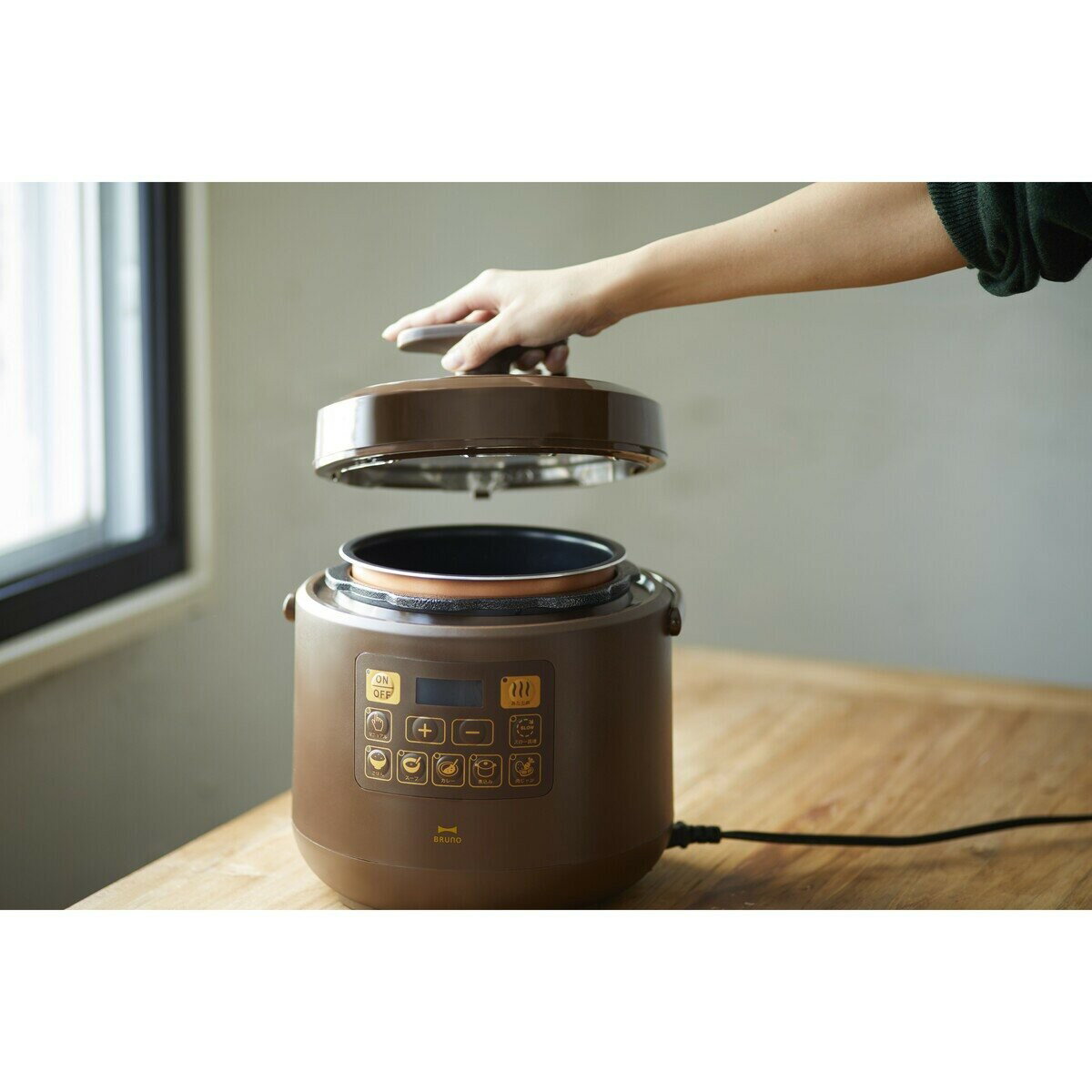 送料無料(沖縄・北海道・離島を除く)☆SDGs提携協力倉庫より発送 BRUNO マルチ圧力クッカー BOE058-BRBRUNO Pressure Cooker BOE058-BR BRUNO マルチ圧力クッカー BOE058-BRBRUNO Pressure Cooker BOE058-BR 商品の特徴火加減の調整が不要なので、調理中はほったらかしでOK。忙しいキッチンでの時間にゆとりが生まれます。5種類の基本料理(ごはん、スープ、カレー、煮込み、肉じゃが)がワンタッチで作れる「ワンタッチメニューモード」に加え、加圧時間を1分単位で設定できる「マニュアルモード」、じっくり煮込んで味が染み込む「スロー調整モード」など、これ一台で幅広い料理レパートリーをお楽しみいただけます。保温・あたため機能搭載で、いつでもできたてのおいしさが愉しめます。内なべは調理容量1.5Lで、家族3~4人にちょうどいいサイズです。いつものおかずから手間のかかる煮込み料理まで、自動調理でできあがります。5種類の基本料理(ごはん、スープ、カレー、煮込み、肉じゃが)はワンタッチボタンで調理できるので、圧力鍋が初めての方にも安心。鍋につきっきりにならないので、時間のない平日などもゆとりが生まれます。ほったらかしの時間は、おかずをもう一品増やしたり、掃除や洗濯を済ませたり、家族と過ごしたり。ワンタッチで、あなたらしい毎日を叶えます。 5