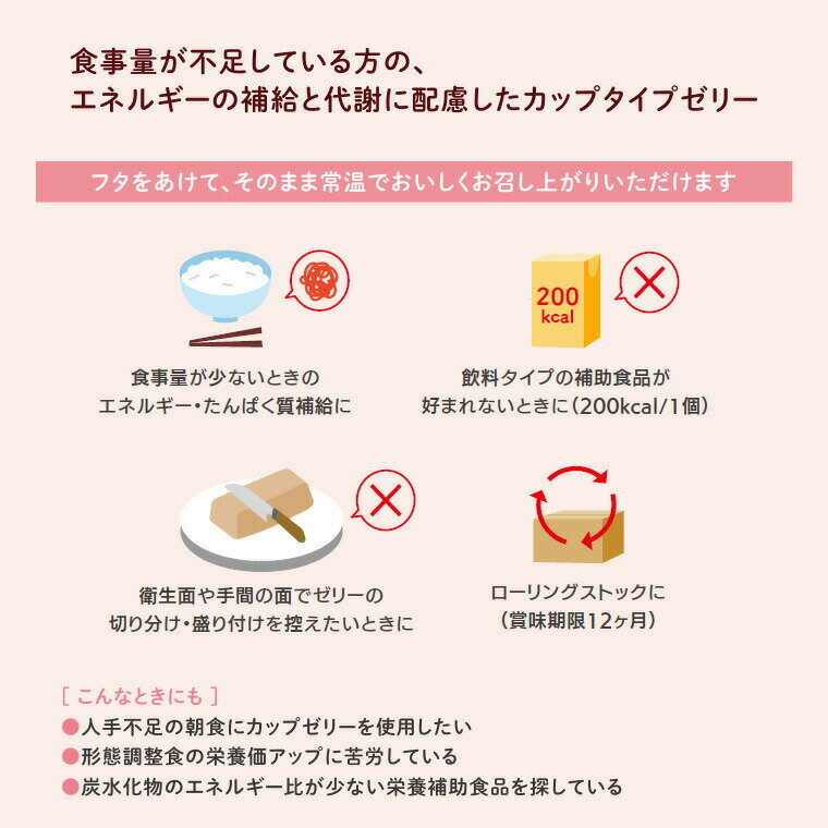 ●原材料/でんぷん分解物、植物油、中鎖脂肪酸トリグリセリド、グラニュー糖、コラーゲンペプチド、脱脂粉乳、寒天、カルニチン/ゲル化剤(増粘多糖類)、カカオ色素、香料、(一部に乳成分・大豆・ゼラチンを含む)●栄養成分/(1個当たり)エネルギー200kcal、たんぱく質4.0g、脂質13.0g、炭水化物16.8g、食塩相当量0.02〜0.14g●アレルギー/乳成分・大豆・ゼラチン●栄養機能食品/たんぱく質●賞味期限/製造後1年●生産国/日本 ・ハイカロリーかつ効率的なエネルギー摂取とたんぱく質摂取に配慮したカップタイプゼリーです。・200kcal/個の高カロリーゼリー。ハイカロリーさを感じさせない味わい。・食事量が少ない方のエネルギー・たんぱく質補給に。飲料タイプが苦手な方におすすめ! 【森永乳業クリニコ】エンジョイMCTゼリー200 あずき味 72g 24個入