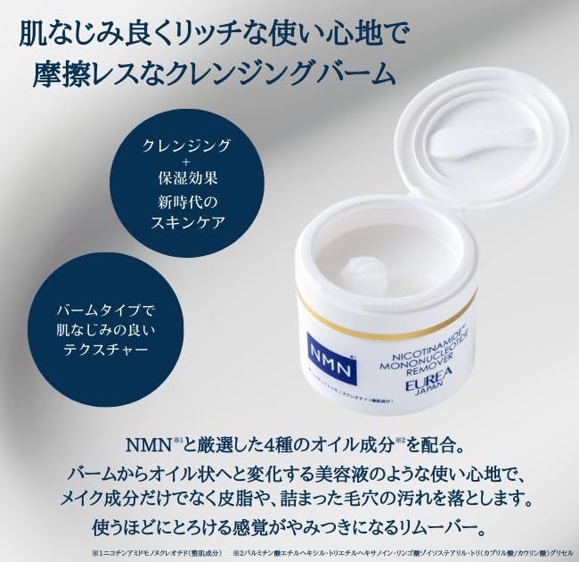 年齢とともに増えるお肌のお悩みへ】年々ハリやうるおい、毛穴が気になり始めている方へおすすめしたい、今話題のNMNを配合したエウレアのメイクアップリムーバー。バームからオイル状へと変化する美容液のようなテクスチャーで、いつものメイクオフとは一味違い、お化粧を落としながらスキンケアができる、お肌でお悩みの方に是非1度お手に取っていただきたい商品です。 酵母由来のNMNを配合】NMN ( ニコチンアミドモノヌクレオチド ) は一般には入手が難しいと言われる希少成分。そのNMNも国内製造にこだわり、確かな効果を感じていただけるように仕上げたエウレアのメイクアップリムーバー。クッション性のあるリッチな使用感でストレスフリーなテクスチャー。 【保湿成分もたっぷり配合】エウレアのメイクアップリムーバーはクレンジングだけでなく保湿・ブライトケア・くすみケアにも高い効果があります。NMNと、厳選した4種のオイルによって使用後もうるおいが持続します。また、メイク成分だけでなく、皮脂や詰まった毛穴の汚れを落とし、使うたびになめらかな肌へと導きます。 【商品詳細】内容量:メイクアップリムーバーム1箱/80g 使用方法:手肌が乾いた状態で、適量(専用スパチュラにさくらんぼ大)を手に取り、顔の中心から外、下から上へマッサージするように全体へなじませます。その後、ぬるま湯でよく洗い流してください。年齢とともに増えるお肌のお悩みへ】年々ハリやうるおい、毛穴が気になり始めている方へおすすめしたい、今話題のNMNを配合したエウレアのメイクアップリムーバー。バームからオイル状へと変化する美容液のようなテクスチャーで、いつものメイクオフとは一味違い、お化粧を落としながらスキンケアができる、お肌でお悩みの方に是非1度お手に取っていただきたい商品です。 酵母由来のNMNを配合】NMN ( ニコチンアミドモノヌクレオチド ) は一般には入手が難しいと言われる希少成分。そのNMNも国内製造にこだわり、確かな効果を感じていただけるように仕上げたエウレアのメイクアップリムーバー。クッション性のあるリッチな使用感でストレスフリーなテクスチャー。 【保湿成分もたっぷり配合】エウレアのメイクアップリムーバーはクレンジングだけでなく保湿・ブライトケア・くすみケアにも高い効果があります。NMNと、厳選した4種のオイルによって使用後もうるおいが持続します。また、メイク成分だけでなく、皮脂や詰まった毛穴の汚れを落とし、使うたびになめらかな肌へと導きます。 【商品詳細】内容量:メイクアップリムーバーム1箱/80g 使用方法:手肌が乾いた状態で、適量(専用スパチュラにさくらんぼ大)を手に取り、顔の中心から外、下から上へマッサージするように全体へなじませます。その後、ぬるま湯でよく洗い流してください。