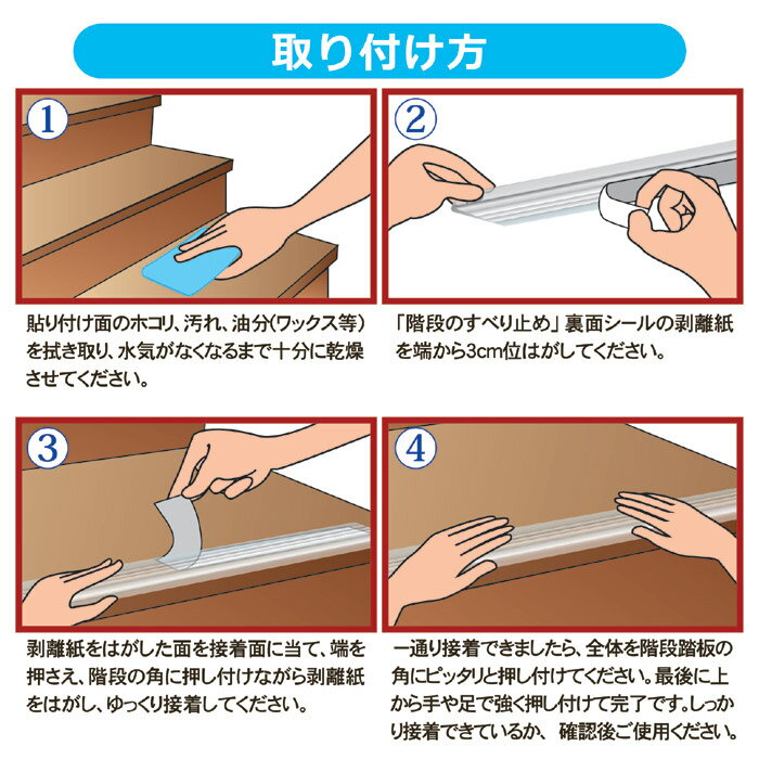 商品名 透明タイプ階段の滑り止めスリム 15本組 規格 原材料:オレフィン系エラストマー、透明両面粘着テープ 個装サイズ(cm)・重量(g):縦8.5奥行3.3横73重量777 ケースサイズ(cm)・重量(g):縦74奥行18横18重量8400 製造販売元:ソーゴ 商品説明 ●透明タイプだから周囲の色、階段の色を選ばない ●足ざわりの良いエラストマーを使用 非常に危険な階段で足を滑らせての事故、階段の事故防止として有効なのが滑り止めです。でも目立ってしまってはイメージも台無しです。そこで「イメージを壊さずに取付けできるスベリ止めはできないだろうか」と、大阪の町工場が考えて作り出したのが、この「透明タイプ階段滑り止めスリムタイプ」なのです。本品は滑り止め機能はそのままに、透明タイプに仕上げた階段専用滑り止めなので、違和感無く設置いただけます。階段の角に合わせて貼るだけ、とても簡単。上面には3本の溝をデザインしてますので滑りにくくなっています。単に「透明タイプ」ということだけでなく、安全第一の商品であるからこそ、メーカーは品質にこだわり、一つ一つ丁寧に作られているそうです。透明タイプの両面テープを使用していますので階段になじみ、貼っても目立ちません。 ※光の当たり具合や見る角度によっては、白っぽく見えることがあります。 ※木製踏板等の平滑な面に接着できます。カーペットやザラザラ面、凸凹面には接着できません。 ※本品をはがす際、無理にはがそうとすると階段踏板の表面がキズついたり、めくれあがる場合があります。ヘアドライヤー等で温めると粘着剤が柔らかくなり、はがしやすくなります。少しづつ丁寧にはがしてください。 製造国 日本 カラー/JAN クリア:4994273002891 クリアブラウン:4994273002969 商品特徴一覧 透明タイプ 階段専用滑り止め 広告文責 (有)パルス 048-551-7965 この商品の意見を書き込む ↑クリックしてね。是非、いろんな意見を下さい♪ (この書き込みはお客様全員が見ることが出来ます♪)『透明タイプ階段の滑り止めスリム 15本組 クリア/クリアブラウン』 透明タイプ 階段専用滑り止め
