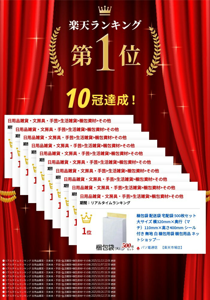 [返品不可] 送料規定・納期はこちらでご確認下さい。★人気のホワイト宅配袋(大サイズ)です。 【主な特長】 ・ 50万枚以上の販売実績 ・ 個人事業主様・法人様に愛されています!業者様も大歓迎! ・ 佐川急便 ヤマト運輸 日本郵便 各社運送業者対応済み ・ MAED IN JAPAN 安心の日本製!メイドインジャパン(過去の実績の中で底が抜けるトラブルは一切ございません) ・ テープ付き 袋を閉じるテープ付きで作業効率アップ(シールを剥がすだけで袋を閉じれる。作業効率アップ、コスト削減) ・ 透けない袋素材 ・ 白色 無地 ・ アパレル 家電 文房具 雑貨 等幅広く使える ・ 各種サイズを取り揃え ・ ネットショッピング運営には欠かせない梱包用袋 ・ 封かん作業が手軽にできる、ベロ部分剥離紙付き。 ・ コスト削減 (1)価格が安い (2)テープ付きで効率アップ (3)高品質でトラブル激減 ・ 厚い しっかりとした厚みがあります。 【検索ワード】 ネットショップ ネコポス 洋服 服 子供服 子ども服 アクセサリー 雑貨 ハンドメイド ネット通販 店舗運営 楽天 楽天市場 Yahoo! Yahoo!ショッピング ヤフー ヤフーショッピング Amazon せどり アマゾン メール便 梱包材 梱包袋 宅急便 宅急便袋 宅配便 宅配 宅配袋 宅配便袋 A4 A4サイズ B5 B5サイズ 【検索外のワード】 緩衝材 プチプチ ビニール袋 段ボール ダンボール 100円ショップ