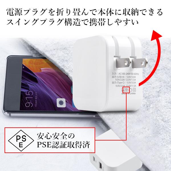 【商品説明】 急速充電が可能なPD充電アダプタです。 電源プラグを折り畳んで本体に収納できるスイングプラグ構造、携帯しやすいです。 安心安全のPSE認証取得済です。 【商品仕様】 カラー ホワイト 出力 最大18W 接続ポート Type-C、USB 認証 PSE認証(電気用品安全法) 掲載商品の仕様や付属品等の詳細につきましては メーカーに準拠しておりますので メーカーホームページにてご確認下さいますよう よろしくお願いいたします。 当店は他の販売サイトとの併売品があります。 ご注文が集中した時、システムのタイムラグにより在庫切れとなる場合があります。 その場合はご注文確定後であってもキャンセルさせて頂きますのでご了承の上ご注文下さい。