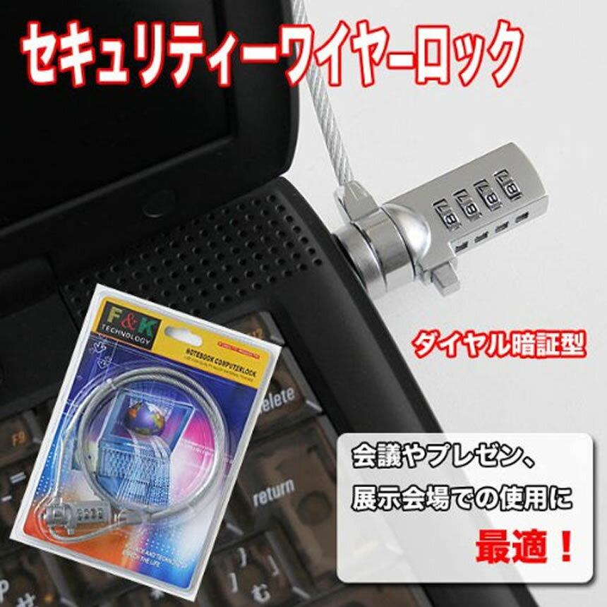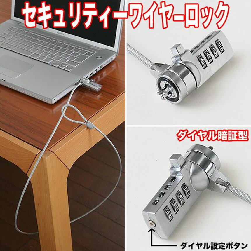 ダイヤル式セキュリティワイヤーロック!! あなたの大切なノートパソコンを盗難から守ります!! 会議やプレゼン、展示会場でのご使用等に、 ロックをしておけば安心して席を外す事が出来ます。 ノートパソコン等のセキュリティスロットに挿し込んで、 机などの固定物や、パソコンバッグの取っ手などに ワイヤーを通し、ワイヤーに接続して使用します。 ダイヤルコードを任意に決めれます。 ご使用方法 1.固定する物に紐を通し輪を作ります。 2.本体のボタンを押しながらノートPCのスロットに差し込みます。 3.始めは「0000」で開錠になっていますが、先の尖った物でダイアル側面を 押しながら任意の番号を選んでください。離すとその番号が開錠番号となります。 ※決定した番号は開錠できる状態以外で変更できませんので、 お忘れのないようにお願いします。【送料無料】メール便での発送予定となります
