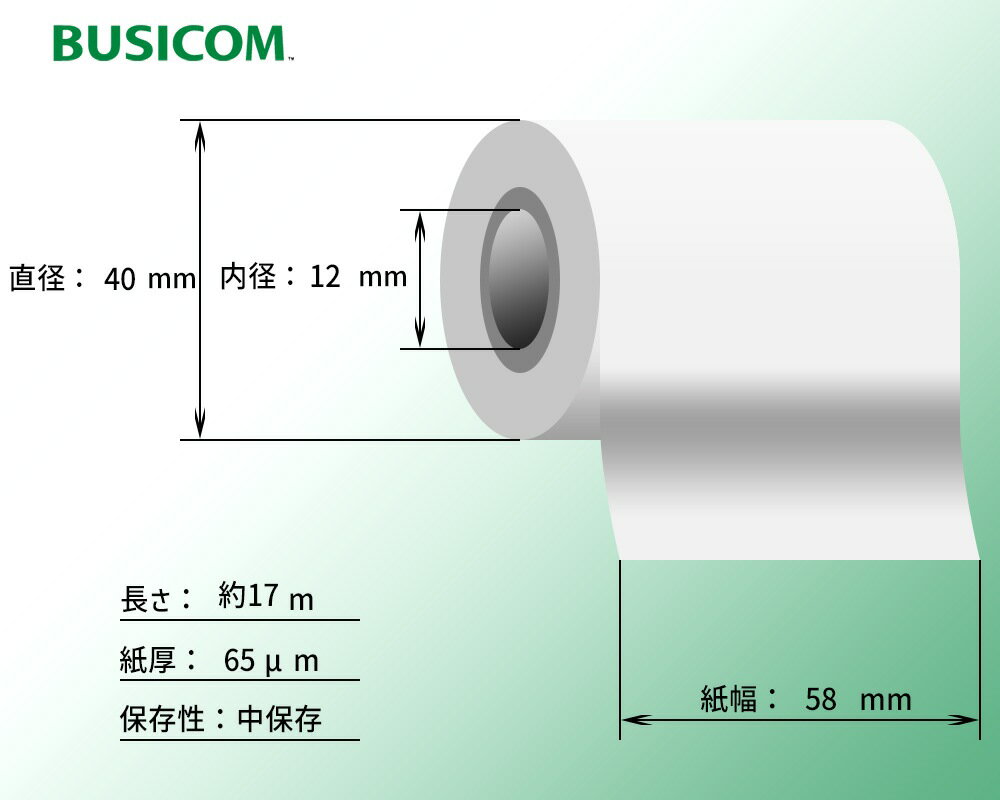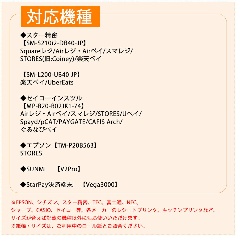 主な対応機種 製品仕様 紙幅 58mm 外径 φ40mm 内径 12mm 芯 有り 紙厚 65μm 紙長 約17m 巻数 200巻 包装仕様 1巻毎に黒ポリ包装、1箱200巻入り(内箱20巻×10)商品箱サイズ:46.2 x 28.2 x 22.2 cm(W×D×H) 対応機種 MP-B20・SM-S210i2・SM-L200 ほか 関連商品 輸入紙20巻入ST584012Y-20H 輸入紙200巻入ST584012Y-200H 国産20巻入ST584012-20K 国産200巻入ST584012-200K■ 主な特徴 ■ ビジコムの純正品。国内でも実績の高い、アジア大手製紙メーカーの輸入紙を使用。コスト削減にお役立てください。 保存性:中保存(製紙メーカー基準:3~5保存) *輸入紙の為、ノーマルの保存期間と同等 1巻ごとに遮光性のある黒ポリ包装で、感熱紙の品質をキープします。 【対応機種】 スター精密:SM-S210i2-DB40-JP※対応レジアプリ:Square/Airレジ/Airペイ/スマレジ/STORES etc.. スター精密:SM-L200-UB40-JP※対応レジアプリ:スマレジ/楽天Pay/UberEats etc.. セイコーインスツル:MP-B20-B02JK1-74※対応レジアプリ:Airレジ/Airペイ/スマレジ/STORES etc.. エプソン:TM-P20B563※対応レジアプリ:STORES etc.. SUNMI:V2Pro※対応レジアプリ:StarPay 決済端末:Vega3000/楽天ペイターミナル etc.. ※対応プリンターについては事前にアプリ会社にご確認ください。サイズが合えば、記載の機種以外にもお使いいただけます。 ★さまざまな業種、いろいろな場所、お店、用途でご利用いただいています! 例えば… コンビニ・美容院・タクシー会社・クリーニング店・病院・学校・図書館・アパレル業・製造業・清掃業・飲食店・パチンコ店・ネットカフェ・ホテル・リサイクルショップ・チケットショップ・レンタルショップ等々