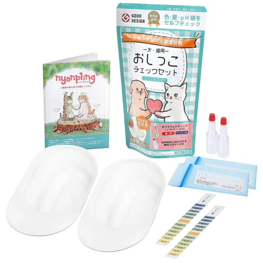 商品情報メーカー名株式会社 森正工業設計生産国日本寸法(長さx幅x高さ)・重量採尿器本体 75×150×23 重量 8gパッケージ入りサイズ:120×220×28 重量:36g内容量2回分原材料・素材採尿器×2(パルプモールド(紙)・防水・抗菌加工)PEHANONカラーチャート付きpH試験紙×2(紙・pH抽出液)スポイト容器×2(本体:PP、キャップ・中栓:PE)記名シール付きジッパー袋×2(シール:紙、袋:PE)獣医師監修おしっこカラーチャート付nyanplingⓇ使い方マニュアル×1(紙)パッケージ:PE賞味期限・使用期限使用期限は設けておりませんが、pH試験紙は3年程度でお使いください。注意事項・本品はペットの疾患や病状を診断、治療するものではありません。・尿色・尿量・尿pH値など、尿の状態を自宅で定期的にチェックすることは、健康管理に役立ちますが、すべての犬や猫に当てはまるわけではありません。尿チェックの結果に関わらず、何らかの症状がある場合はすぐに動物病院を受診してください。また、健康な時から定期的な健康診断/尿検査を受けましょう。・尿の性状は時間の経過や保管方法によって変化します。自宅で計測した尿のpH値と、動物病院で計測したpH値は異なる場合があります。・トイレの形状やトイレの中での排尿位置、犬や猫の性格によっては採尿が難しい場合があります。排尿中にトイレに近づくことができないようなデリケートな性格の犬や猫には不向きです。極度に嫌がる場合は、無理に採尿を行わないようにしてください。・ドーム型や深さがあるトイレ、自動トイレなど、容器を差し込むスペースがないトイレは直接採尿には不向きです。採尿がしやすい、カバーがない大きくてフラットなトイレがおすすめです。・採尿器は小型~中型犬、猫用サイズですので、尿が容器からあふれてしまう場合、尿量をチェックすることはできませんが、色やpH値などの尿の状態をチェックすることは可能です。尿が手にかかりそうな場合は、手袋やビニール袋で手をガードすることをおすすめします。・使用後は、お住まいの地域のルールに従って廃棄してください。・採尿器は水に溶けないので、トイレに流さないでください。尿をご家庭のトイレに破棄する場合は、採尿器やセット用品をトイレに流さないようにご注意ください。・本品は1回使い切りです。採尿器・pH試験紙・スポイト容器の繰り返しての使用はできません。・本品は、高温多湿、火気をさけ、直射日光の当たらない場所に保管してください。思わぬトラブルを避けるために、犬や猫、お子さま、認知症の方などの手の届かない場所に保管してください。万が一、飲み込んだり食べてしまった場合は、医師や獣医師にご相談ください。・開封後は、パッケージのチャックをしっかりと閉めて適切に保管してください。また、採尿器を清潔に保つため、容器の内側に触れないようにしてください。・採尿器は、自然由来のエコ素材であるパルプモールド製品(紙)です。原料に由来する黒色等の色のついた繊維等が混入する場合があります。こちらは製造過程で完全に取り除くことができません。使用には差し支えありませんので、何卒ご了承ください。広告文責ワンニャンおやつのぺきやさん愛知県岡崎市舳越町東沖98-108069449982代表:福西久美子犬猫用おしっこチェックセット(2回分)尿色・尿量・尿pH値 セルフチェック 採尿器 おうちでチェック 犬 猫 簡単尿検査 愛犬・愛猫の「尿色・尿量・尿pH値」を自宅でチェック!特許取得の採尿器!排尿中のペットのお尻の下にスッと差し入れて簡単に尿をキャッチ!おうちでpH値をチェックできる試験紙付き! *愛犬・愛猫の「尿色・尿量・尿pH値」を自宅でチェック!*特許取得の採尿器!排尿中のペットのお尻の下にスッと差し入れて簡単に尿をキャッチ!*おうちでpH値をチェックできる試験紙付き!*動物病院に尿を提出するためのスポイト容器付き!【こんなワンちゃん・ネコちゃんに】・おしっこトラブルの経験がある・ペタンと座っておしっこ派・動物病院で尿検査をしたことがない・外出がニガテ・最近、おしっこが気になる[量・回数・色・pHなど] ・もっと簡単に採尿がしたい・自宅で尿をチェックしたい・固まる猫砂派・多頭飼い【採尿器のポイント】一目で尿の状態が分かって便利!尿の色や状態が見やすい白色の採尿器。写真を撮って記録すれば、「うちの子のおしっこ記録」が完成!紙素材なので、ハサミでカットしてサイズ調節もできます。動物病院の尿検査にもおすすめ!猫砂やシートを介さないので、不純物の混入が少ない尿を採取できます。ペットにも飼い主さんにも負担が少ない!事前のトイレ掃除などの必要がなく、気になったときにすぐに尿チェックができます。外出がニガテなペットでも、自宅で採尿ができれば、尿だけ動物病院に持参しての尿検査が可能になります。【尿pHについて】尿pH値は、犬猫の健康状態を知る手がかりになります。尿pH値が高すぎても(酸性)や低すぎても(アルカリ性)、尿に結晶ができやすい状態である