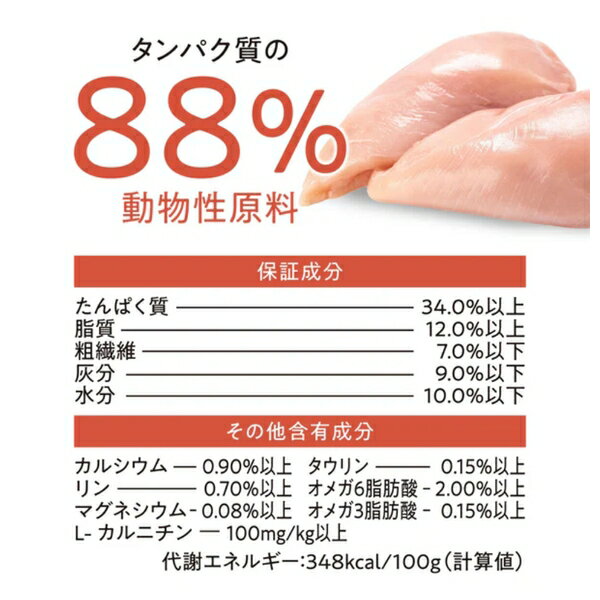 商品の特徴 ◇ジェックス Catit Recipes WEIGHT CONTROL 体重ケア 成猫用 チキン400g ●Catit Recipes 体重ケア 成猫用はオメガ3脂肪酸、タウリン、プロバイオティクスを配合し、成猫の健康的な体重維持をサポートする総合栄養食です。低脂肪レシピで健康的な体重維持をサポートします。※ADULTより脂肪分20%カット。高たんぱくレシピで健康な代謝をサポート、プロバイオとプレバイオで腸の健康をサポートします。 ●愛猫の健康を考えて、18種類の高品質の自然素材を贅沢に配合。ホルモン剤・抗生物質を与えず育てた高品質な鶏を第一原材料として使用し、動物性タンパクを豊富に含みます。 ●89% 動物性タンパク比率。新鮮な鶏肉を使用した高タンパクのレシピで、成猫が必要とする動物性タンパクを効果的に供給します。 ●ダブルフリーズドライ製法 1.フリーズドライを加えた高タンパクのキブル-高タンパクで歯ごたえのあるキブルに、フリーズドライの素材そのままのおいしさをプラスしています。2.素材のおいしさそのまま フリーズドライキューブ-鶏肉に、栄養豊富なサツマイモ・カボチャ・タラ肝・緑イ貝・昆布をミックスしてフリーズドライ。おいしさをギュッと凝縮しました。 ●低脂肪レシピで健康的な体重維持をサポート(ADULTシリーズ比 脂肪分20%カット)。高たんぱくレシピで健康な代謝をサポートし、プロバイオとプレバイオで腸の健康をサポートします。 ●1日2~3回に分けて与えてください。肥満気味の猫の場合は、現在の体重ではなく理想的な体重を目安にしてください。猫の種類・性別・運動量・環境などによって、必要な食事量は変動しますので、必要に応じて調整してください。新鮮な水をいつでも飲めるようにしてください。食べ残しは腐敗の原因になりますので取り除いてください。 製品仕様 ●内容量400g ●原産国カナダ ●原材料骨抜き鶏肉、チキンミール、レンズ豆、エンドウ豆、オートミール、アルファルファミール、大麦、ナチュラルチキンフレーバー、鶏脂肪、フリーズドライ(チキン、サツマイモ、カボチャ、タラ肝、緑イ貝、昆布)、エンドウ豆繊維、魚油、リンゴ、ブルーベリー、ニンジン、クランベリー、カボチャ、ショウガ、 酵母エキス、イヌリン、ユッカエキス、ビフィズス菌発酵産物、エンテロコッカスフェシウム菌発酵産物、ラクトバチルスアシドフィルス菌発酵産物、 ラクトバチルスカゼイ菌発酵産物、ヒマワリ油、キャノーラ油、ビタミン類(コリン、E、C、ナイアシン、パントテン酸、B2、A、B1、B12、K、B6、ビオチン、D3、葉酸)、ミネラル類(カリウム、ナトリウム、亜鉛、鉄、カルシウム、マンガン、銅、セレン、ヨウ素)、アミノ酸類(タウリン、DL-メチオニン、L-リジン、L-カルニチン)、酸化防止剤(ビタミンE、クエン酸、ローズマリー抽出物) ●栄養成分値たんぱく質34.0%以上、脂質12.0%以上、粗繊維7.0%以下、灰分9.0%以下、水分10.0%以下、カルシウム0.90%以上、リン0.70%以上、マグネシウム0.08%以上、タウリン0.15%以上、オメガ6脂肪酸2.00%以上、オメガ3脂肪酸0.15%以上、L-カルニチン100mg/kg以上 ●代謝エネルギー348kcal/100g ●粒サイズキブル約7mm、フリーズドライキューブ約9mm。 JANコード:4972547928498 ※商品詳細につきましてはメーカーHP等よりご確認下さいますようお願いいたします。※商品のデザイン、仕様は予告なく変更する場合がありますのでご了承ください。