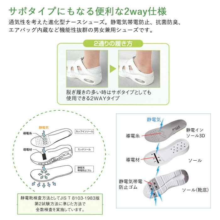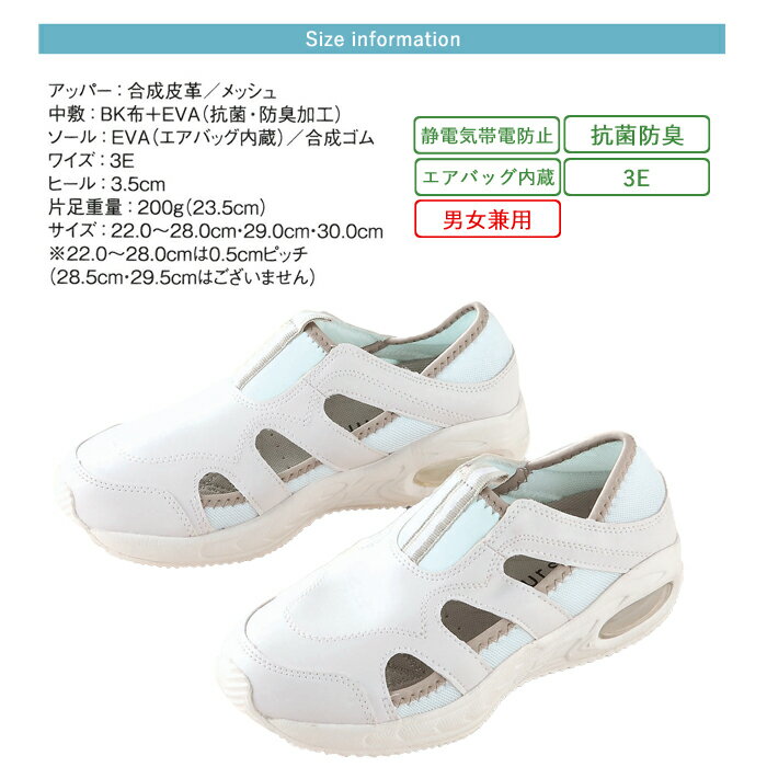 通気性を考えた進化型ナースシューズが登場。 静電気帯電防止や抗菌防臭、エアバッグ内蔵とたくさんの便利な機能が備わっています。 バックバンドを踏んでサボタイプとしてもご使用いただける便利な2wayタイプ。 通気性をはじめとした機能性抜群の男女兼用ナースシューズです。 ■素材 アッパー:合成皮革/メッシュ 中敷:BK布+EVA(抗菌・防臭加工) ソール:EVA(エアバッグ内蔵)/合成ゴム ■仕様 ワイズ:3E ヒール高:約3.5cm 片足重量:約200g(23.5cmの場合) ■サイズ サイズ:22.0〜28.0cm、29.0cm、30.0cm ※ブルー、ピンクは22.0〜26.0cmまでとなります。詳細は画像をご確認ください。 <注意事項> ※表記サイズは全てメーカー記載のサイズとなります。 採寸方法や素材により多少の誤差がございますので、ご了承下さい。 ※お客様のご覧になられますパソコン機器及びモニタなどの違いにより、実際の商品素材の色と相違する場合もありますのでご了承下さい。[2207] 関連シューズはこちら